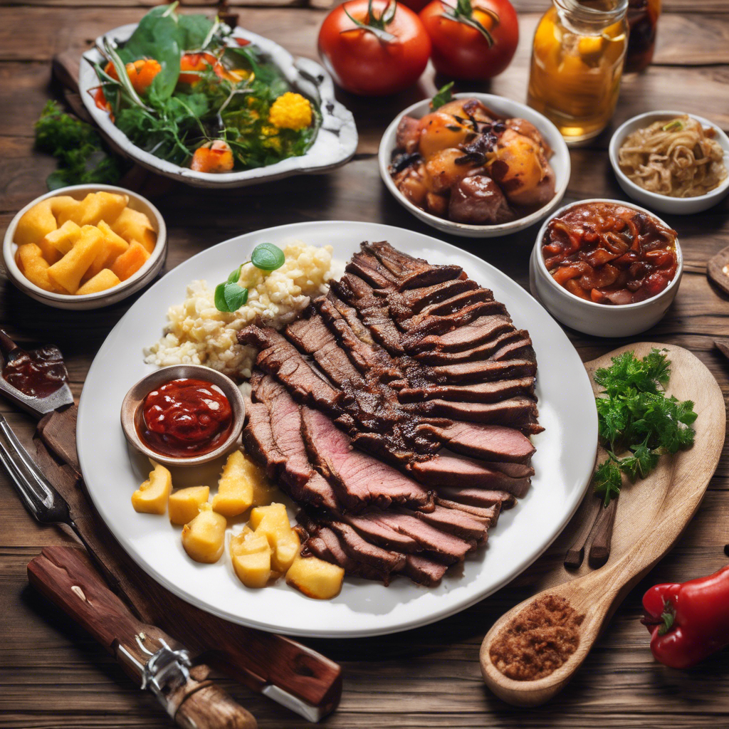 A delicious and tender smoked brisket served with savory sides, perfect for a barbecue or family gathering.