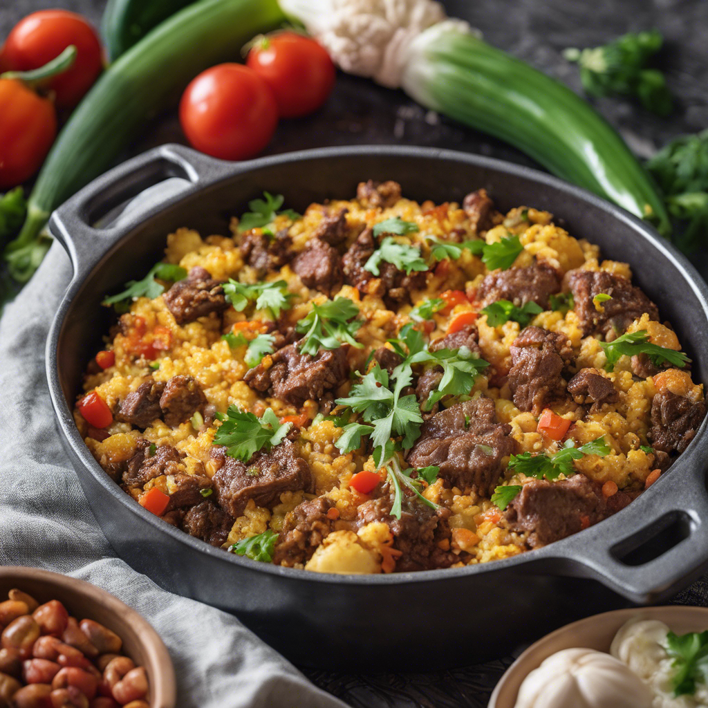 A flavorful and healthy casserole made with spicy beef, mixed vegetables, and cauliflower rice.