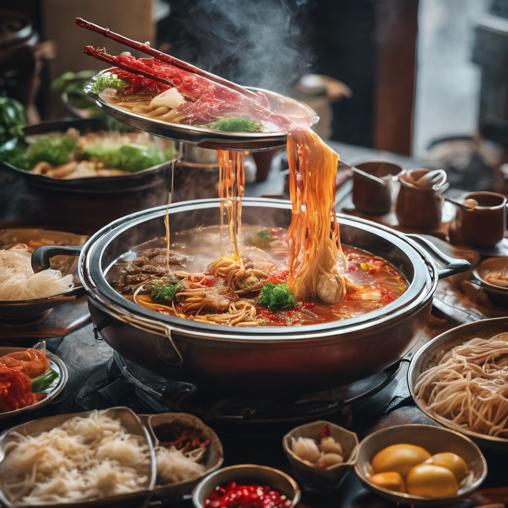 A traditional Chinese hot pot dish with thinly sliced lamb and a variety of fresh vegetables cooked in a flavorful broth.