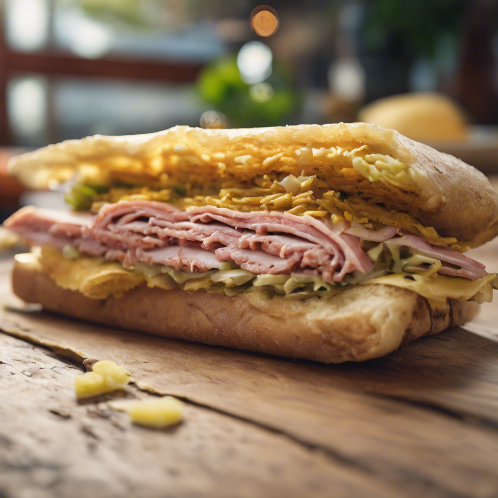 A classic Cuban sandwich with ham, roasted pork, Swiss cheese, pickles, and mustard on Cuban bread.