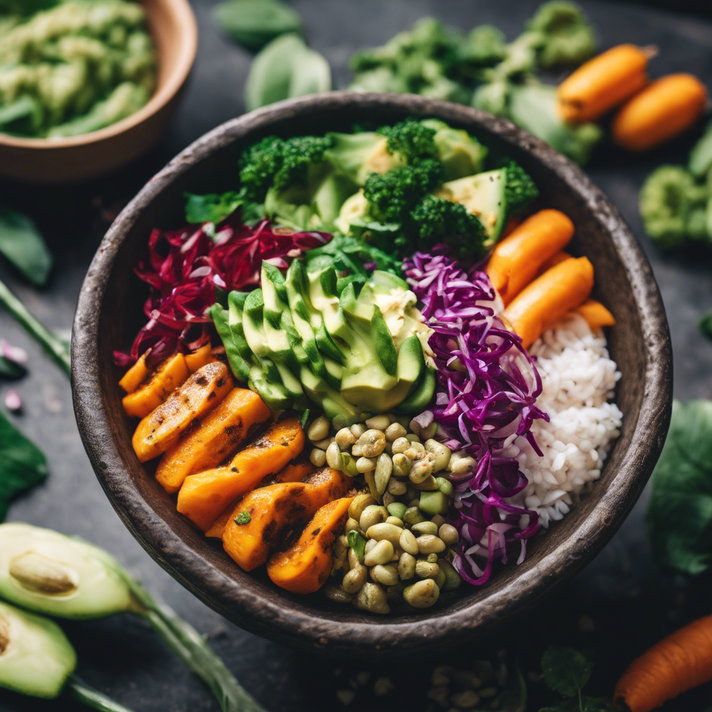 A colorful and nutritious vegan meal in a bowl, packed with grains, vegetables, and a flavorful dressing.