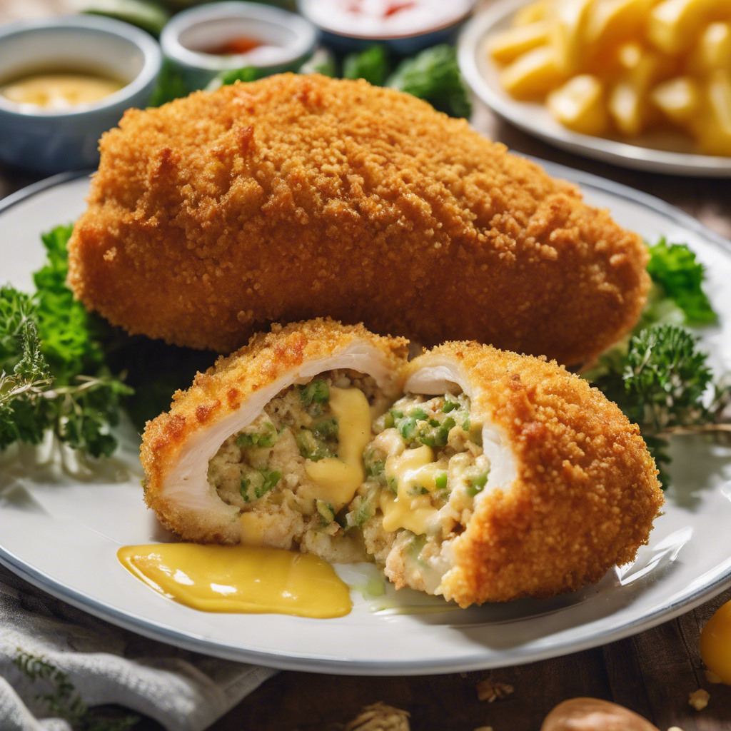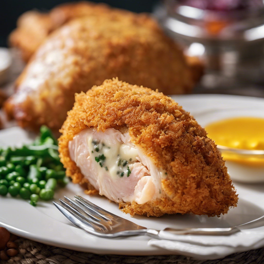 A classic dish of breaded and fried chicken breast with a flavorful garlic butter filling.