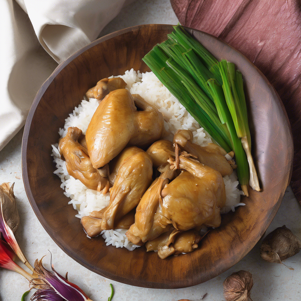 - In a large bowl, combine the chicken thighs, soy sauce, vinegar, garlic, onion, bay leaves, and whole peppercorns. Marinate for at least 30 minutes.