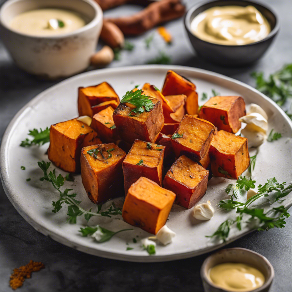 - Once the sweet potato cubes are done, transfer them to a serving plate and serve hot with the garlic aioli dip on the side.