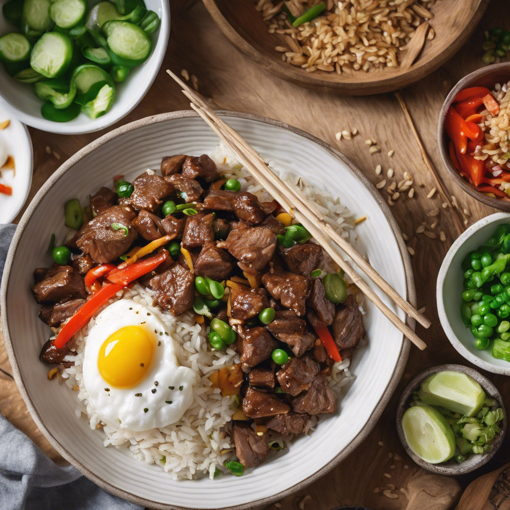 Asian Beef and Rice Stir-Fry is a popular dish with origins in East and Southeast Asia. This flavorful and aromatic dish typically features tender slices of beef, stir-fried with a colorful array of vegetables and served over steamed rice. Renowned chefs like Ming Tsai and Martin Yan have popularized this dish, infusing it with their own unique twists. The dish is a staple in Chinese, Thai, and Japanese cuisine, with each region adding its own distinct flavors and ingredients. The key to a perfect stir-fry lies in the balance of savory soy sauce, sweet hoisin, and the right level of heat. For an authentic experience, seek out a reputable Asian restaurant known for their expert stir-fry techniques.