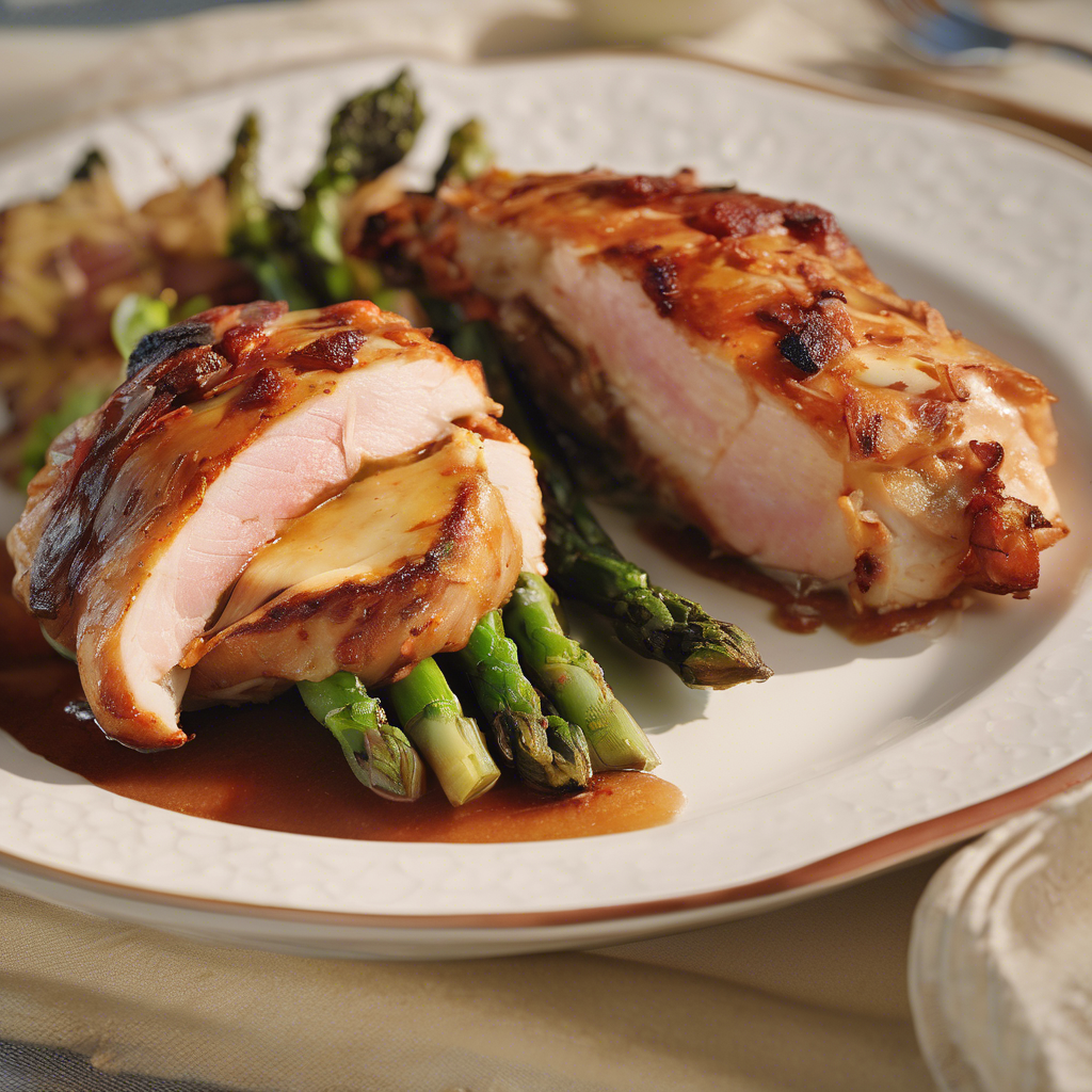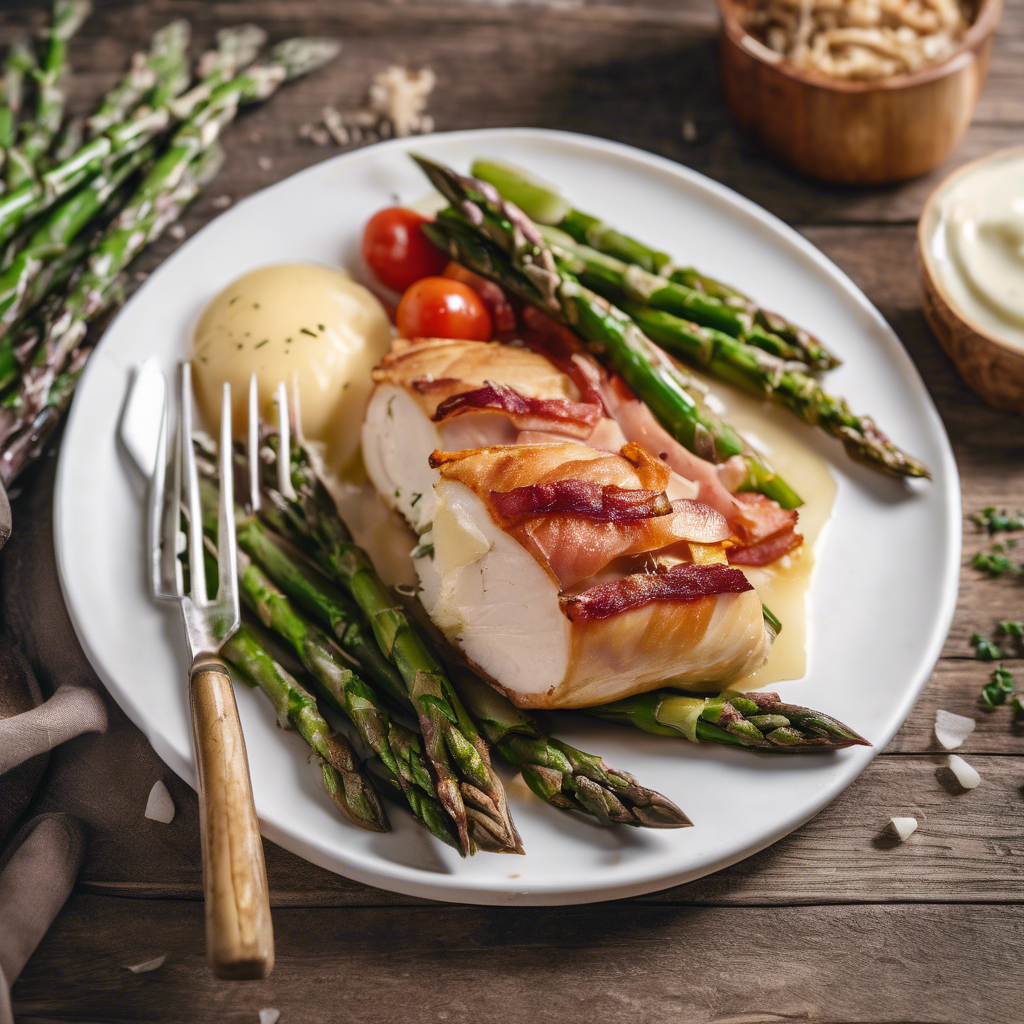 The history of Asparagus and Swiss Cheese Stuffed Chicken Breast wrapped in bacon is a tale of culinary innovation and indulgence. This delectable dish combines the succulent flavors of tender chicken breast, savory Swiss cheese, and crisp asparagus, all enveloped in smoky bacon. Originating in the heart of Europe, this dish has been perfected by skilled chefs in regions renowned for their culinary expertise, such as France, Switzerland, and Italy. The combination of asparagus and Swiss cheese adds a delightful contrast of textures and flavors, while the bacon wrapping infuses the chicken with a rich, smoky essence. This dish has become a staple in upscale restaurants and fine dining establishments, where it is often prepared with meticulous attention to detail and presented as a gourmet masterpiece. For those seeking the ultimate rendition of this dish, renowned restaurants in the Swiss Alps or the French countryside are known for their exceptional execution of this recipe. The key to achieving perfection lies in the quality of the ingredients, particularly the asparagus, Swiss cheese, and bacon. Each component must be carefully selected to ensure a harmonious blend of flavors. While the traditional method involves wrapping the chicken breast in bacon, an alternative approach involves encasing the filling in a delicate puff pastry, adding a layer of indulgent flakiness to the dish. Whether prepared with a classic or innovative twist, Asparagus and Swiss Cheese Stuffed Chicken Breast wrapped in bacon continues to captivate the palates of discerning food enthusiasts around the world.