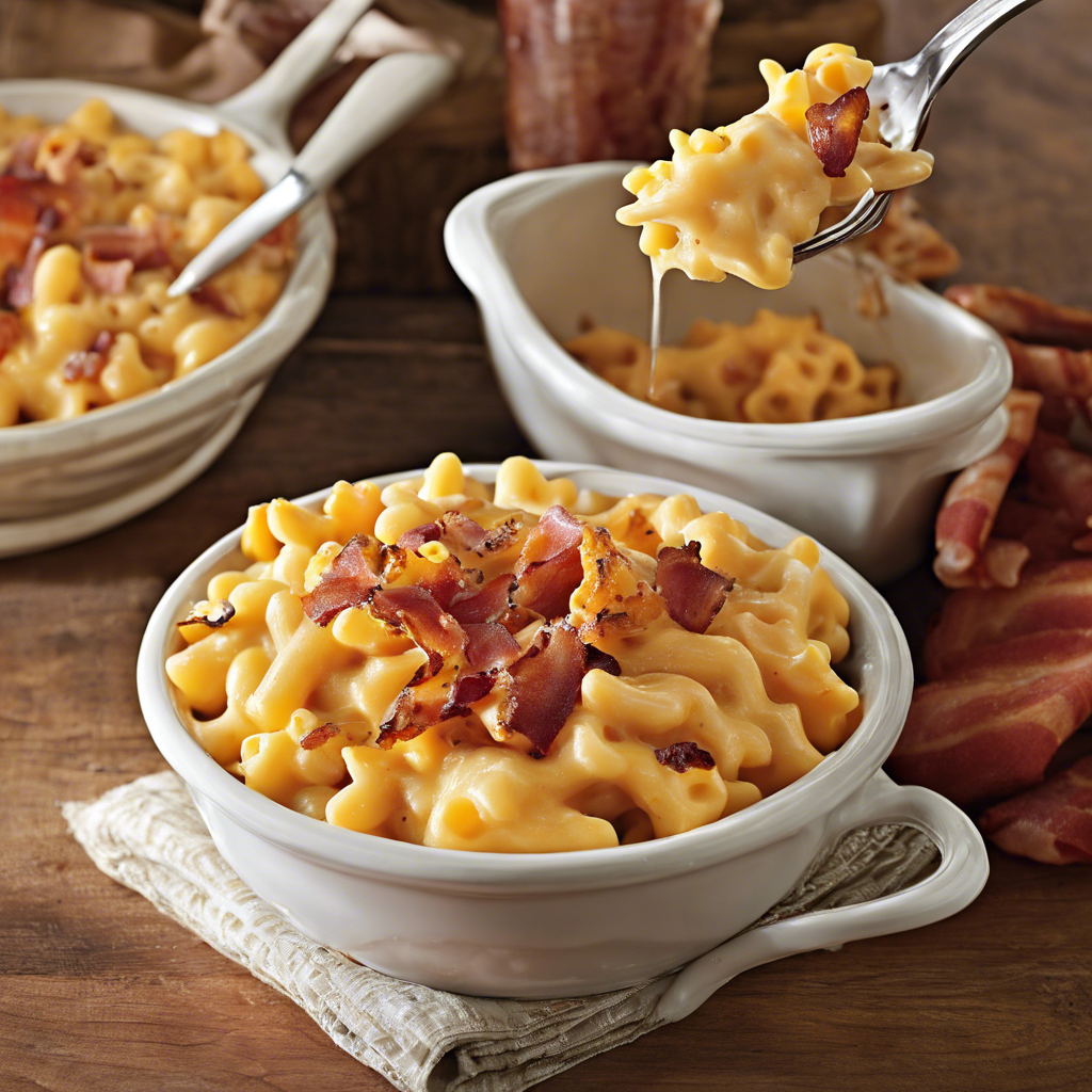 Bacon and Cheddar Macaroni and Cheese is a beloved comfort food that has been enjoyed for generations. This classic dish combines the creamy goodness of cheddar cheese with the smoky, savory flavor of bacon, all mixed with tender macaroni noodles. It's a dish that has its roots in American home cooking, but has also been popularized by chefs and restaurants across the country. The rich and indulgent flavors of this dish make it a favorite at family gatherings, potlucks, and casual dining establishments. For the best version of this dish, look for a recipe that uses high-quality cheddar cheese and crispy, flavorful bacon. Some chefs also add a touch of spice or a crunchy breadcrumb topping to elevate the dish even further. Whether enjoyed as a side dish or a main course, Bacon and Cheddar Macaroni and Cheese is sure to satisfy any comfort food craving.