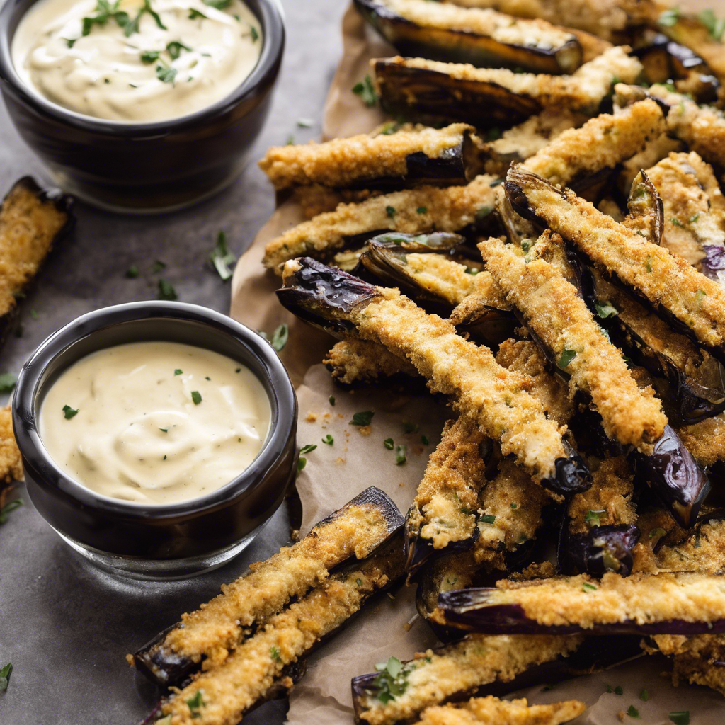 - Once the eggplant fries are done, remove them from the oven and let them cool for a few minutes. Serve the crispy baked eggplant fries with the creamy garlic aioli dipping sauce. Enjoy!