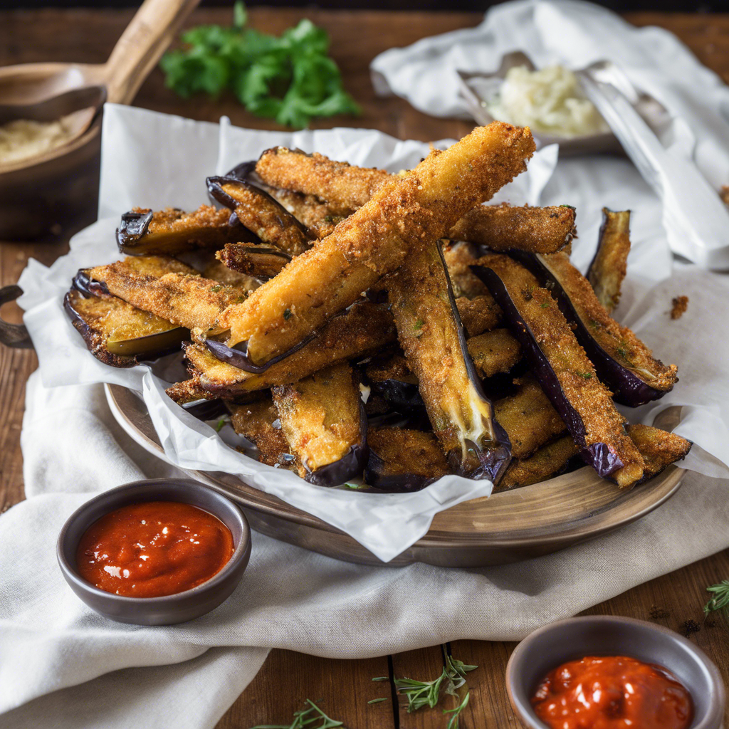 - Dip the eggplant fries into the beaten eggs, then coat them with the breadcrumb mixture, pressing gently to adhere the coating to the eggplant.