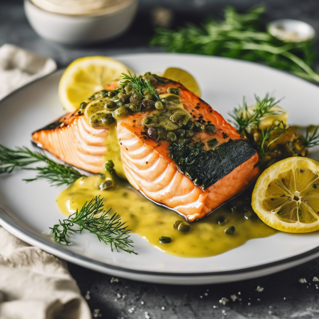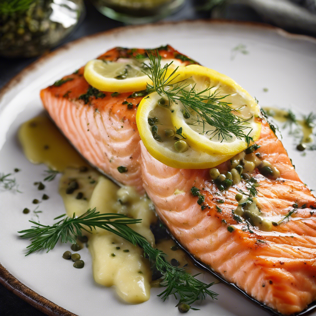 Baked Salmon with Dill Butter topped with a zesty lemon caper sauce is a classic dish that has been enjoyed for centuries. The combination of tender, flaky salmon, fragrant dill butter, and tangy lemon caper sauce creates a symphony of flavors that is sure to delight the palate. This dish has its roots in Scandinavian cuisine, where salmon is abundant and dill is a popular herb. Over time, it has become a staple in upscale seafood restaurants around the world. Chefs like Gordon Ramsay and Jamie Oliver have put their own spin on this dish, elevating it to new heights. For the best version of this dish, look for fresh, high-quality salmon and be sure to prepare the dill butter and lemon caper sauce with care. Whether you're dining at a Michelin-starred restaurant or cooking at home, this dish is a true crowd-pleaser.