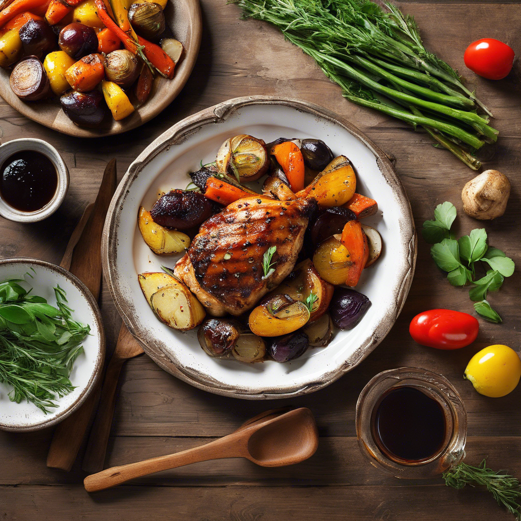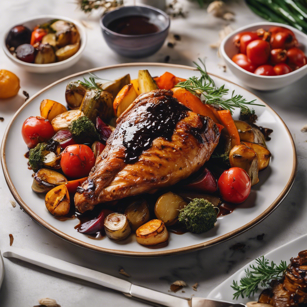 Balsamic Glazed Chicken with Roasted Vegetables is a classic dish that originated in Italy, known for its rich flavors and vibrant colors. The dish features succulent chicken breasts marinated in a balsamic glaze, then roasted to perfection alongside a colorful medley of vegetables such as bell peppers, zucchini, and cherry tomatoes. This dish has been a staple in Italian cuisine for centuries, with its roots in the Emilia-Romagna region, where balsamic vinegar is a prized local ingredient. Renowned chefs like Lidia Bastianich and Mario Batali have popularized this dish in their restaurants, showcasing the perfect balance of sweet and tangy flavors. Today, the best versions of this dish can be found in authentic Italian trattorias, where the quality of the balsamic glaze and the freshness of the vegetables are paramount. To nail this dish, it's crucial to get the balsamic glaze just right, as it's the key to achieving that irresistible sweet and tangy flavor. While the traditional recipe calls for roasting, some chefs also recommend grilling the chicken and vegetables for a smoky twist on this classic dish. Whether enjoyed in a cozy trattoria in Italy or prepared at home, Balsamic Glazed Chicken with Roasted Vegetables is a delightful culinary experience that captures the essence of Italian cuisine.