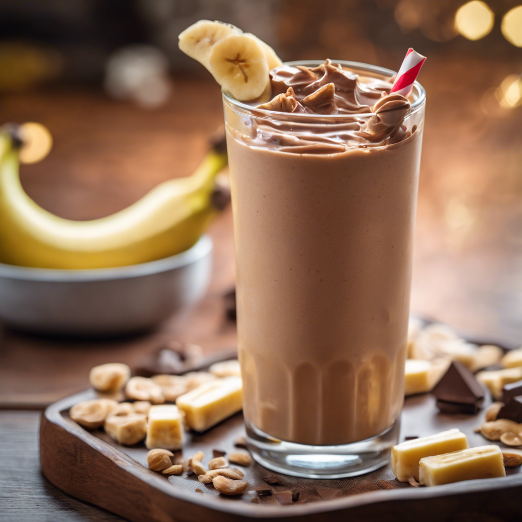 - In a blender, combine 1 ripe banana, 1 scoop of chocolate protein powder, 1 tablespoon of peanut butter, 1 cup of almond milk, and 1/2 cup of ice cubes.