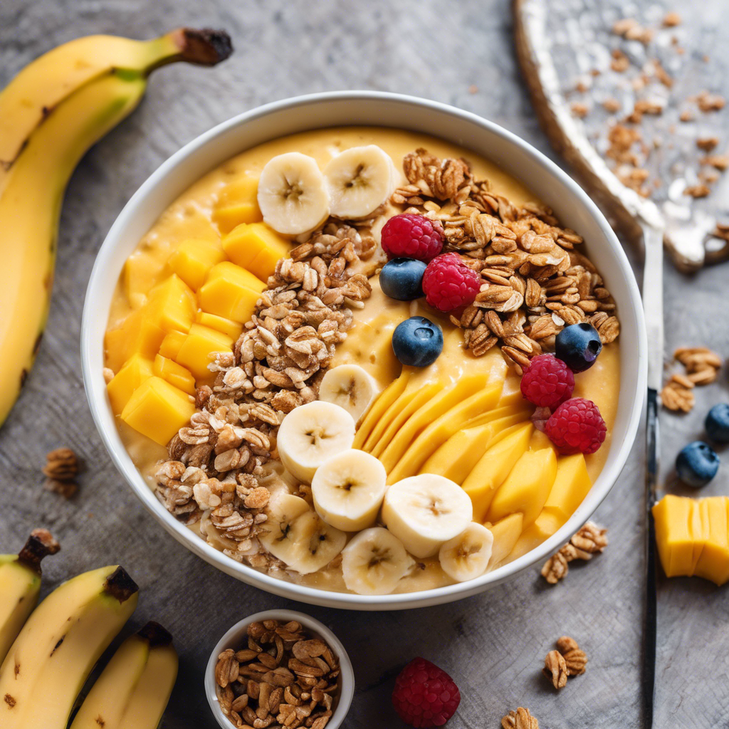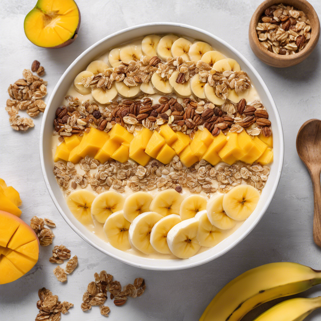 The Banana Mango Smoothie Bowl is a delightful and refreshing dish that has gained popularity in the health food scene. This tropical-inspired bowl features a creamy blend of ripe bananas and sweet mangoes, creating a luscious base bursting with flavor. Topped with crunchy granola, it adds a satisfying texture and a hint of nuttiness to the mix. This dish has become a staple in many brunch spots and health-conscious cafes, especially in coastal regions where fresh tropical fruits are abundant. Chefs often take pride in sourcing the freshest, ripest fruits to ensure the smoothie bowl is bursting with natural sweetness. The best versions of this dish can be found in tropical regions where the fruits are locally sourced, ensuring the highest quality and flavor. The key to getting this dish right lies in the perfect balance of ripe bananas and mangoes, as well as the quality of the granola topping. The granola should be crunchy and slightly sweet, complementing the creamy smoothie base. While almonds are a popular choice for topping, granola adds a delightful twist, offering a mix of oats, nuts, and dried fruits for a more diverse texture and flavor profile. Whether enjoyed for breakfast or as a refreshing snack, this Banana Mango Smoothie Bowl with granola is a delightful treat that captures the essence of tropical indulgence.