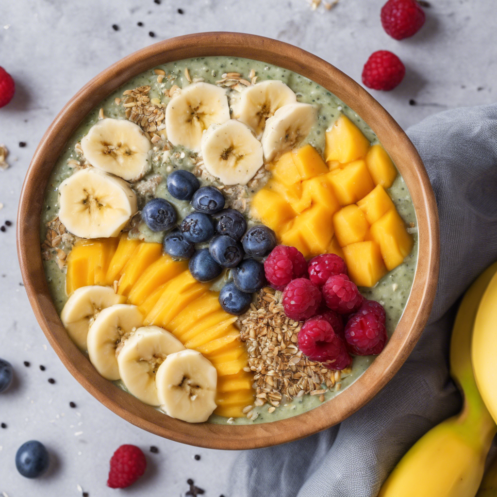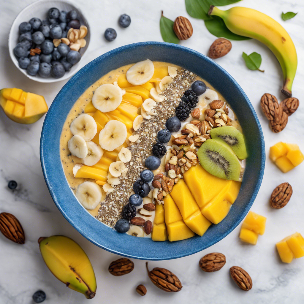 - In a blender, combine 2 ripe bananas, 1 ripe mango, 1 cup of Greek yogurt, 1/2 cup of almond milk, and 2 tablespoons of chia seeds.