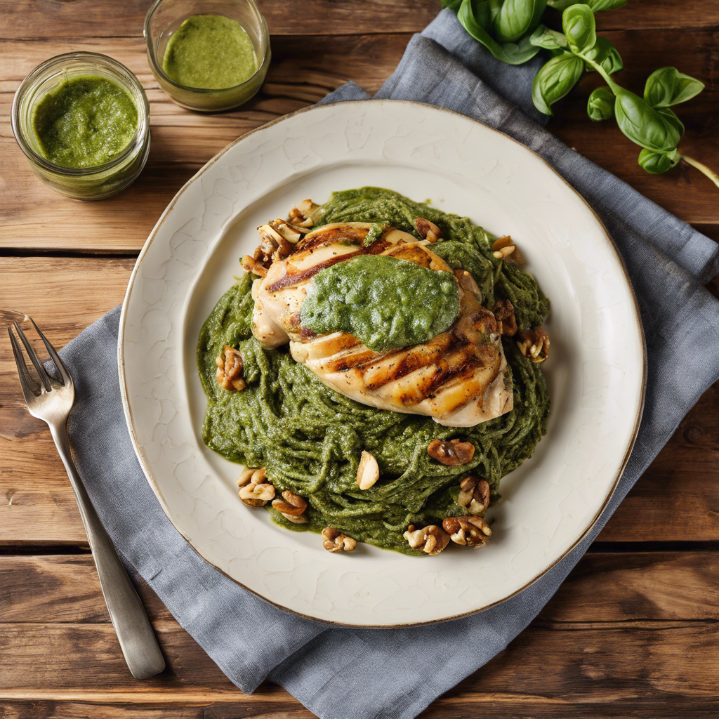 - Remove the chicken from the grill and let it rest for a few minutes. Then, spoon the basil walnut pesto over the top of each chicken breast.
