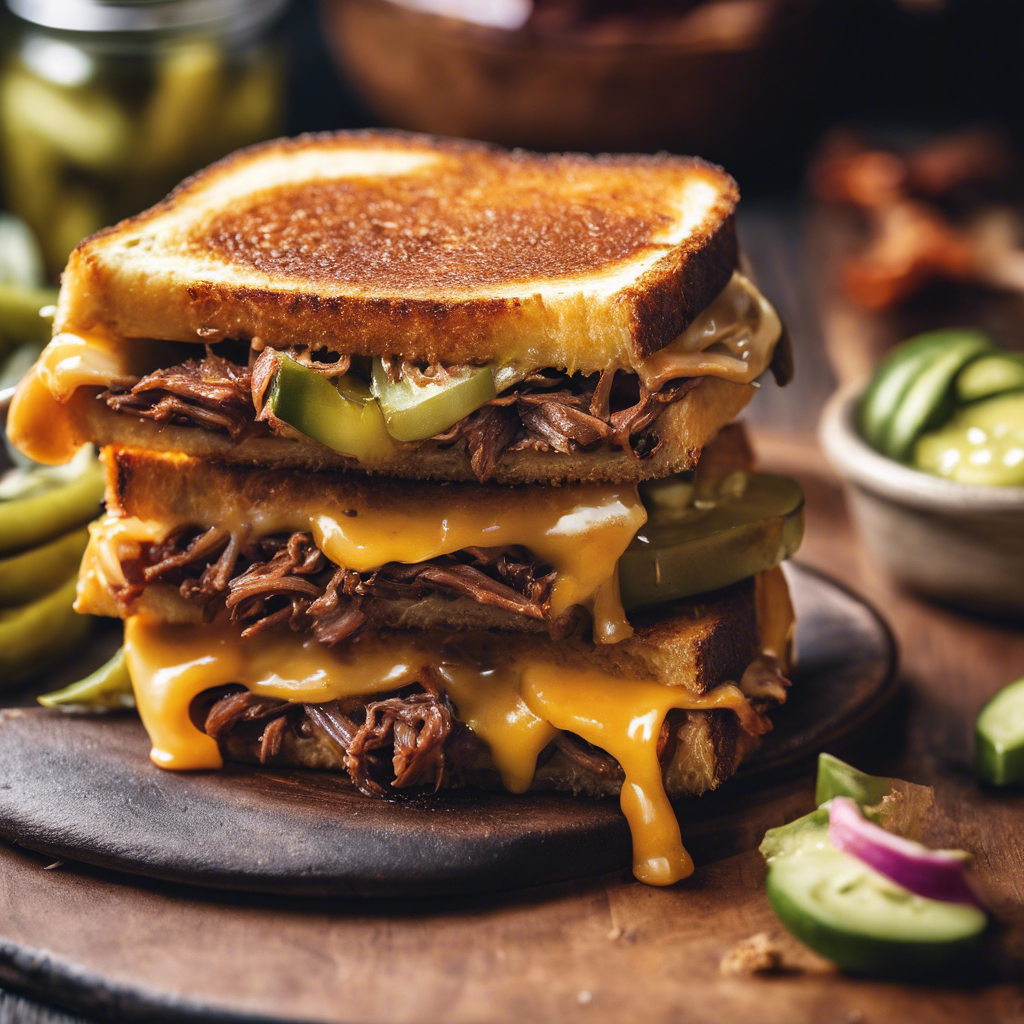 The history of BBQ Pulled Beef Grilled Cheese with pickles can be traced back to the southern United States, where BBQ and grilled cheese are beloved culinary traditions. This mouthwatering creation combines tender, smoky pulled beef with tangy BBQ sauce, gooey melted cheese, and zesty pickles, all sandwiched between perfectly grilled bread. Renowned chefs and home cooks alike have put their own spin on this classic, adding their favorite cheeses, homemade BBQ sauces, and pickles for a unique twist. The dish has gained popularity in BBQ joints and diners across the country, with some claiming that the best version can be found in the heart of Texas or at a famous BBQ festival in Memphis. The key to perfecting this dish lies in the quality of the pulled beef, the richness of the BBQ sauce, and the crunch of the pickles, all coming together in a symphony of flavors and textures. Whether enjoyed at a bustling food truck or made at home, this indulgent grilled cheese is a must-try for any BBQ enthusiast.