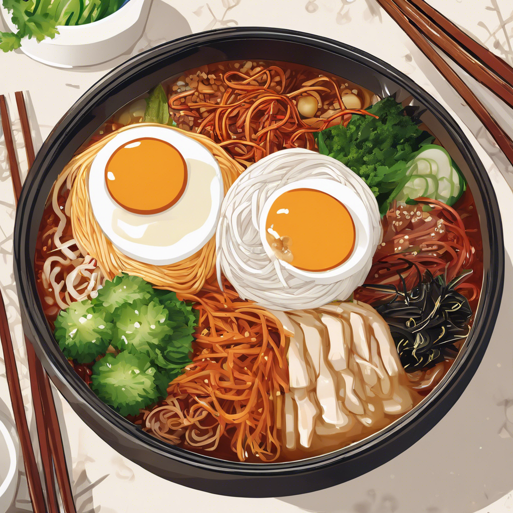 Bibim Naengmyeon is a popular Korean cold noodle dish with a spicy, tangy flavor. Originating from North Korea, it gained popularity in South Korea after the Korean War. The dish features long, thin noodles made from buckwheat and sweet potato starch, topped with a spicy sauce, thinly sliced vegetables, and often a boiled egg or slices of beef. The dish is known for its refreshing and invigorating taste, making it a favorite during hot summer months. Notable restaurants like Pyeongyang Myeonok in Seoul are renowned for their authentic Bibim Naengmyeon. The key to a great Bibim Naengmyeon lies in the balance of the spicy sauce and the chewy texture of the noodles. For a twist, some chefs add pear or apple to the sauce for a hint of sweetness. Whether enjoyed in a bustling city or a quaint countryside, Bibim Naengmyeon is a delightful culinary experience not to be missed.