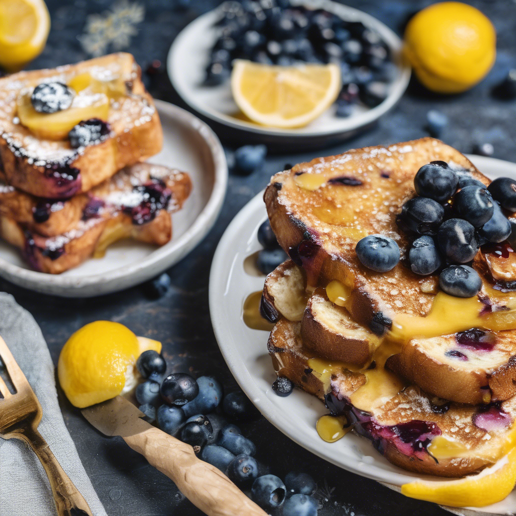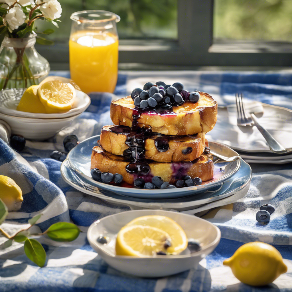 Blueberry Lemon French Toast is a delightful twist on the classic breakfast dish. This delectable creation features thick slices of bread soaked in a mixture of eggs, milk, and a hint of lemon zest, then cooked to golden perfection. The dish is then topped with a generous serving of fresh blueberries and a drizzle of tangy lemon syrup, adding a burst of fruity flavor to every bite. This mouthwatering dish has a rich history, with roots in French cuisine and a modern American twist. Renowned chefs and restaurants across the United States have put their own spin on this beloved dish, incorporating local ingredients and innovative techniques to create a truly unforgettable breakfast experience. One of the best versions of this dish can be found in the charming cafes of New England, where the combination of sweet blueberries and zesty lemon perfectly complements the region's fresh, seasonal produce. The key to a perfect Blueberry Lemon French Toast lies in the quality of the bread, the balance of flavors in the egg mixture, and the freshness of the blueberries and lemon. For those looking to try a famous alternative method for making this dish, consider using brioche or challah bread for an extra indulgent and buttery texture. Additionally, some chefs recommend adding a touch of vanilla extract to the egg mixture for an extra layer of flavor. Whether enjoyed at a cozy brunch spot or homemade in your own kitchen, Blueberry Lemon French Toast is a delightful way to start the day, offering a harmonious blend of sweet, citrusy, and comforting flavors that are sure to satisfy.