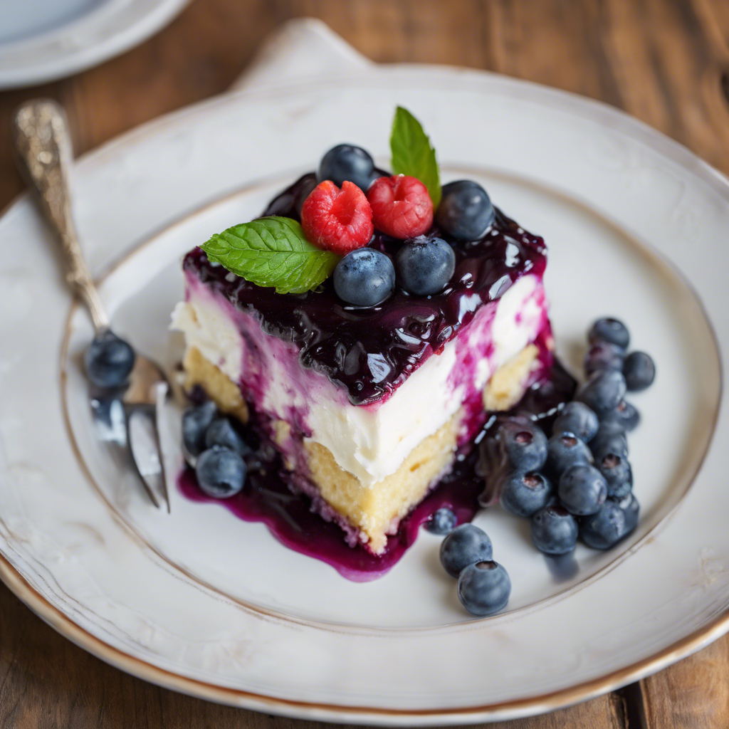 Blueberry Tres Leches is a delightful twist on the classic Latin American dessert. This indulgent treat features a light sponge cake soaked in three types of milk—evaporated milk, condensed milk, and heavy cream—infused with the sweet and tangy flavor of blueberries. The dish has its roots in traditional Tres Leches, which originated in Central America and has since become popular across the Americas. Renowned chefs and bakeries have put their own spin on this dessert, incorporating fresh blueberries and creative presentations. For the best Blueberry Tres Leches experience, seek out establishments known for their mastery of this dessert, or consider making it at home with ripe, juicy blueberries and a moist, flavorful sponge cake.