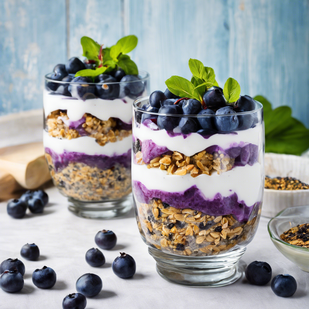 - In two serving glasses, layer the yogurt mixture, fresh blueberries, and granola, repeating until the glasses are filled.