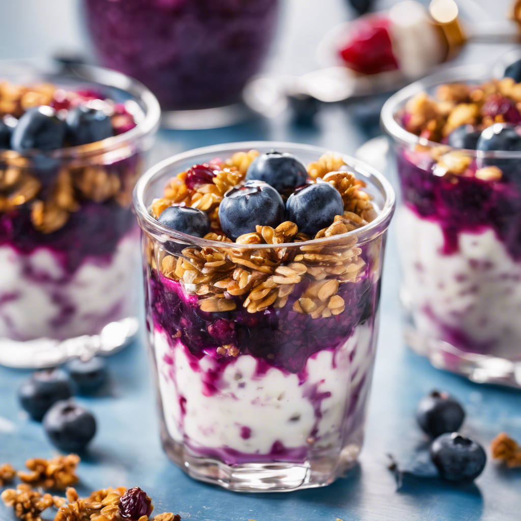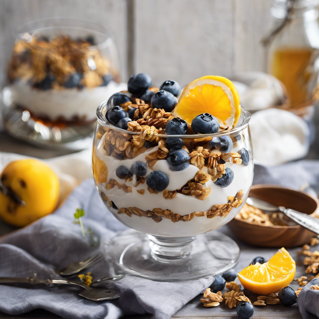 The Blueberry Yogurt Parfait with granola and honey drizzle is a delightful and healthy treat that has become a staple in breakfast and brunch menus across the world. This dish has its origins in the health-conscious food movement of the 1970s, where chefs and health enthusiasts sought to create delicious yet nutritious options. The combination of creamy yogurt, fresh blueberries, crunchy granola, and a drizzle of golden honey creates a symphony of flavors and textures. Chefs in regions known for their fresh blueberries, such as the Pacific Northwest in the United States and the Provence-Alpes-Côte d'Azur region in France, have perfected this dish. Today, the best versions of this parfait can be found in trendy cafes and health-focused eateries. The key to a perfect Blueberry Yogurt Parfait lies in using high-quality, thick yogurt, ripe and sweet blueberries, crunchy granola with a hint of nuts and seeds, and a generous drizzle of locally sourced honey. For a twist, some chefs also add a sprinkle of toasted coconut or a dollop of almond butter. Whether enjoyed as a light breakfast, a post-workout snack, or a guilt-free dessert, the Blueberry Yogurt Parfait with granola and honey drizzle is a true crowd-pleaser.