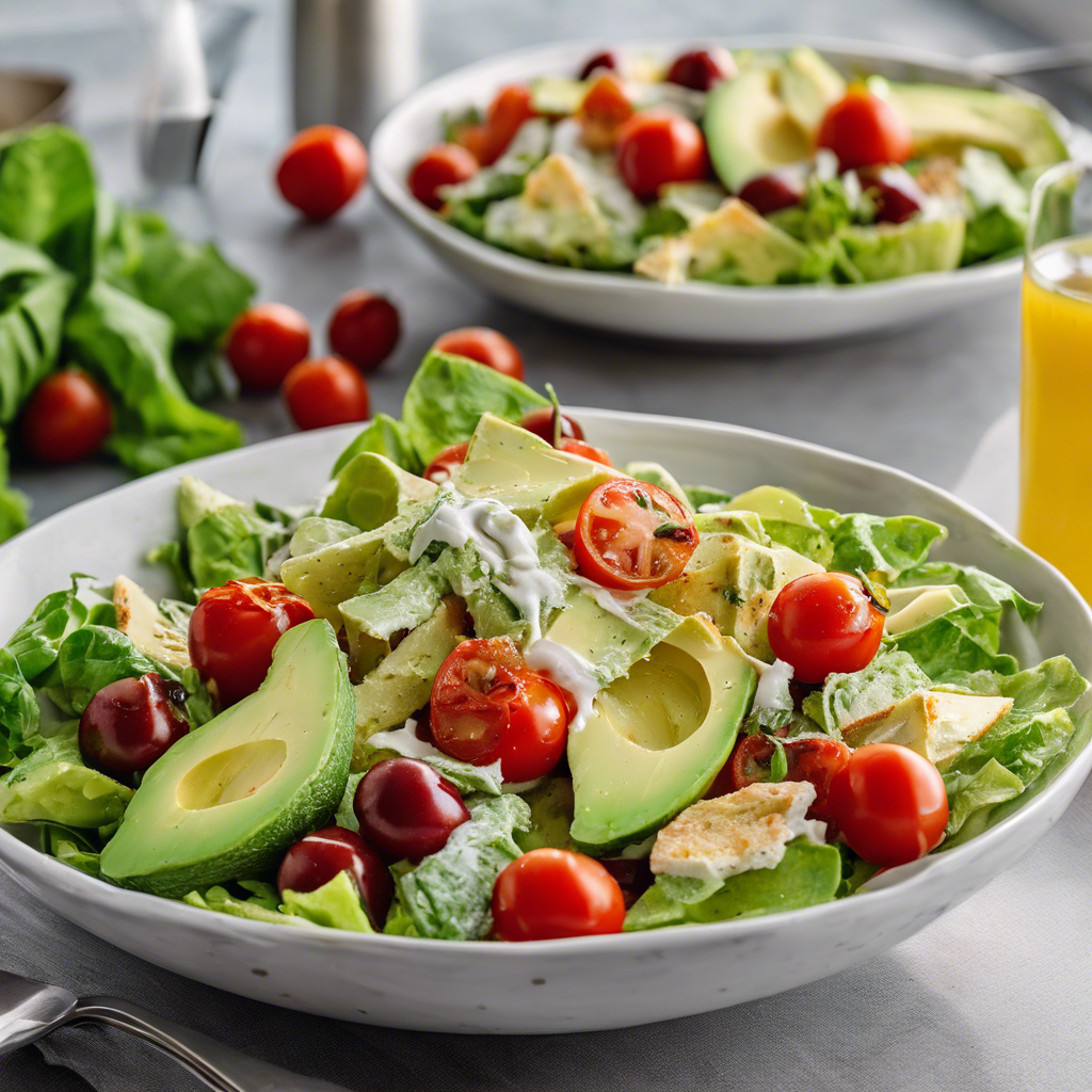- In a large salad bowl, combine 2 heads of chopped romaine lettuce, 2 diced ripe avocados, and 1 cup of halved cherry tomatoes.