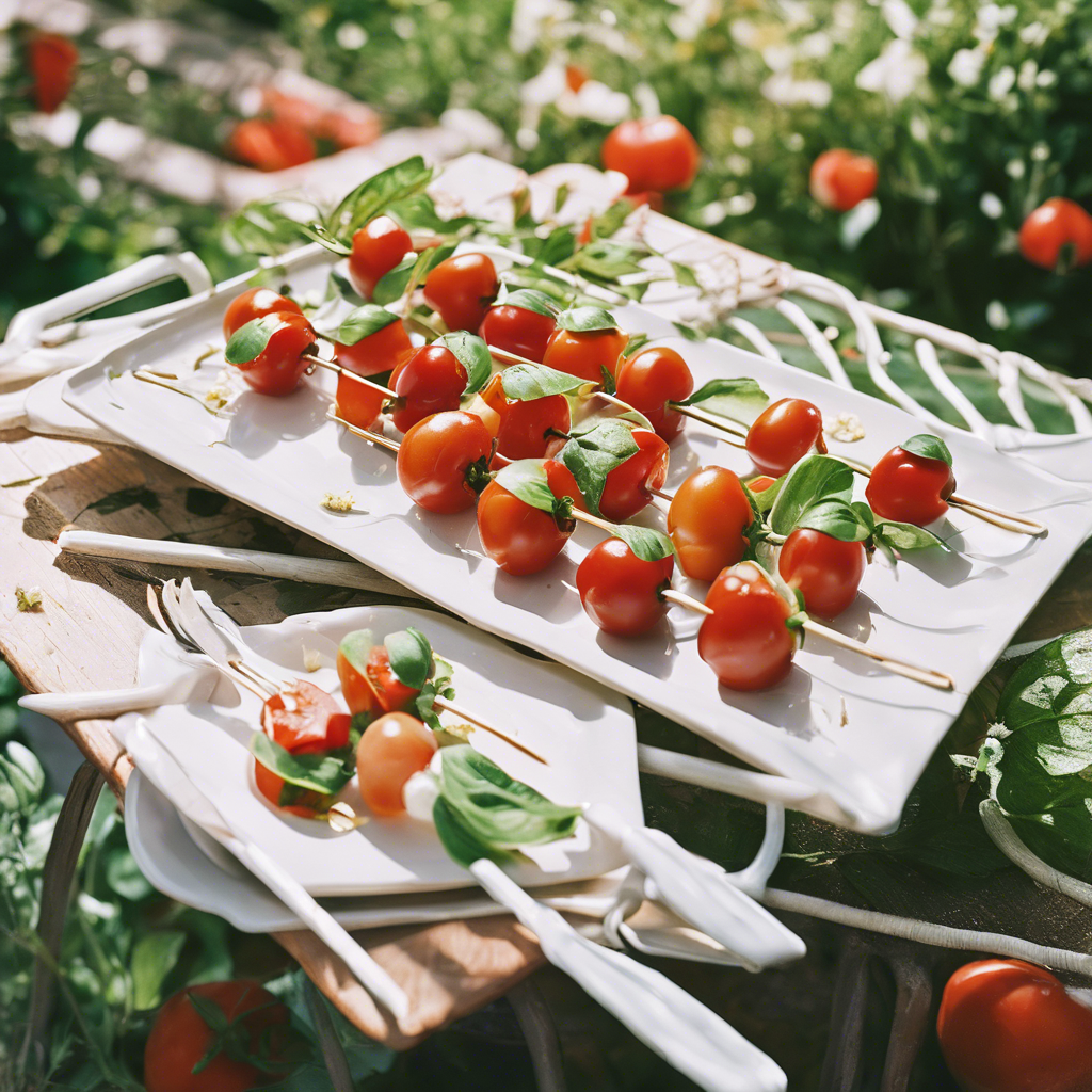 - To assemble the skewers, thread a cherry tomato, a cube of mozzarella, and a basil leaf onto each skewer. Repeat until all ingredients are used.