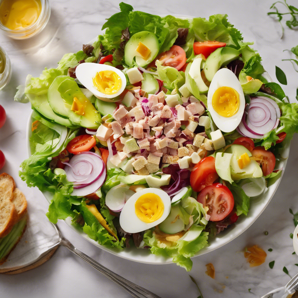 - In a large bowl, combine 4 cups of mixed salad greens, 1 cup of cherry tomatoes, 1 cup of cucumber, 1 cup of cooked and diced chicken breast, 1/2 cup of sliced red onion, 1/2 cup of shredded cheddar cheese, 4 hard-boiled eggs, 1/2 cup of sliced black olives, and 1/4 cup of chopped fresh parsley.