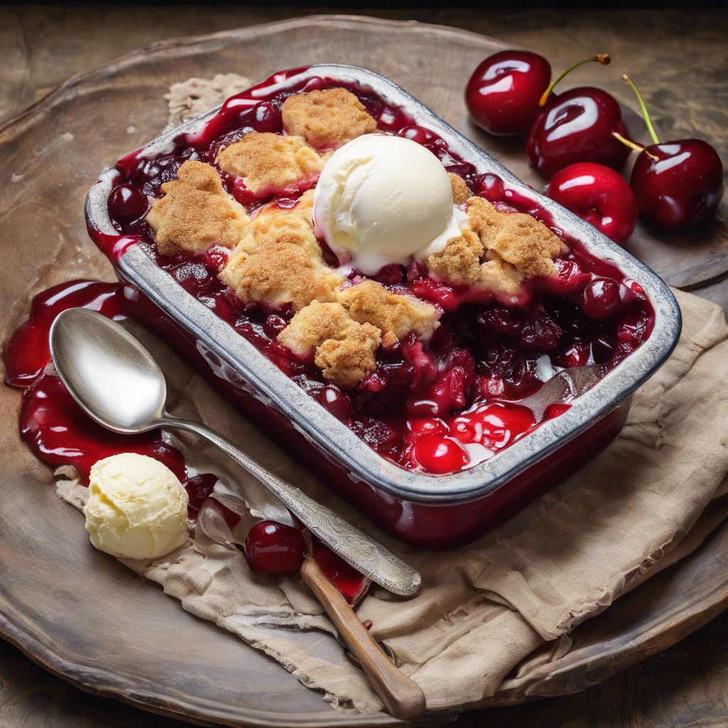 Cherry Cobbler is a classic American dessert that has been enjoyed for generations. This sweet and tangy dish is made with juicy cherries and a buttery, crumbly topping. The addition of a scoop of creamy vanilla ice cream takes this dessert to the next level, creating a perfect balance of flavors and textures. The history of Cherry Cobbler dates back to early American settlers who adapted their traditional fruit desserts to the ingredients available in the New World. Over time, it became a staple in Southern cuisine, with variations emerging in different regions. Today, it is a beloved dessert served in homes and restaurants across the country. One famous version of Cherry Cobbler can be found at the renowned Magnolia Bakery in New York City. Their recipe features ripe, tart cherries and a golden, biscuit-like topping that pairs perfectly with a generous scoop of homemade vanilla ice cream. To make the best Cherry Cobbler, it's essential to use fresh, high-quality cherries and a buttery, crumbly topping that bakes to a golden perfection. Some chefs also add a hint of almond extract to enhance the flavor of the cherries. For a unique twist, consider adding a sprinkle of cinnamon or a splash of bourbon to the cherry filling. Whether enjoyed at a cozy family dinner or a fancy restaurant, Cherry Cobbler with a scoop of vanilla ice cream is a delightful treat that captures the essence of traditional American comfort food.