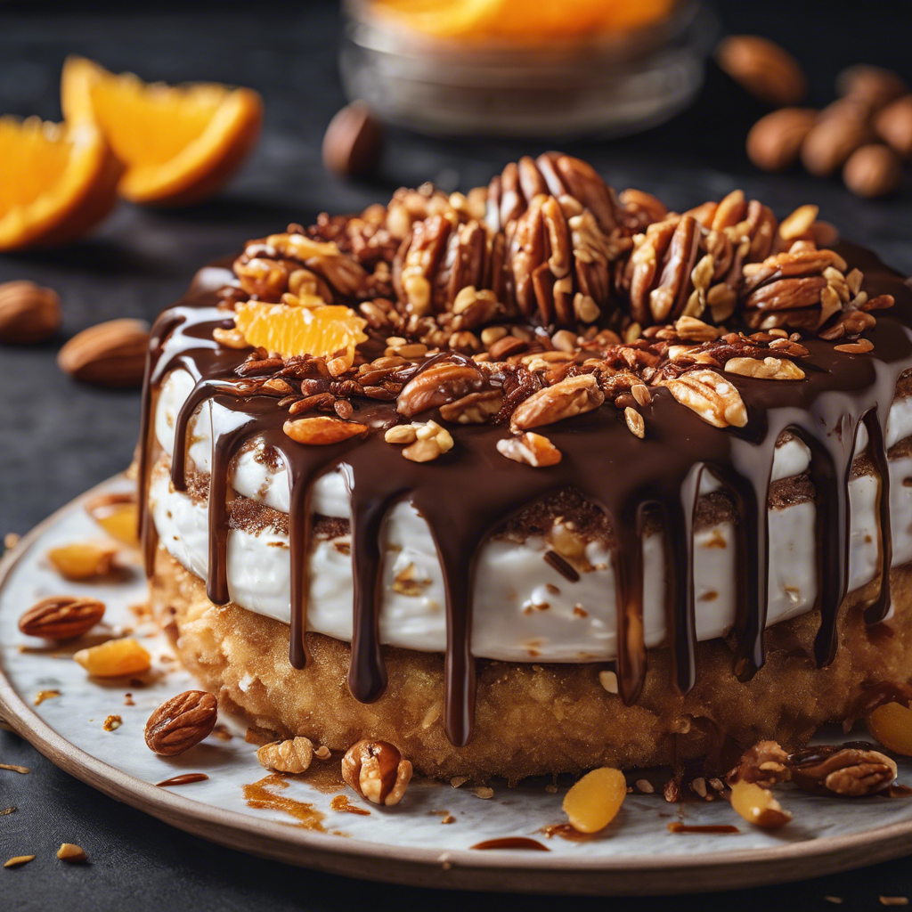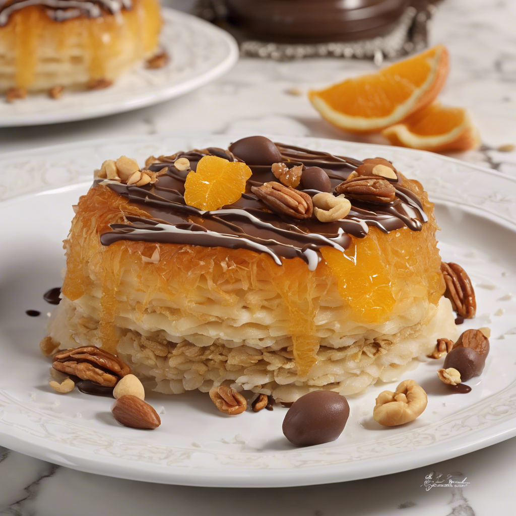 The Chocolate Drizzled Kunafa with Caramelized Nuts, infused with a hint of orange zest, is a delectable Middle Eastern dessert that has captivated taste buds for centuries. Originating in the Levant region, this dessert is a modern twist on the traditional kunafa, a pastry made of shredded phyllo dough, filled with nuts, and soaked in sweet syrup. The addition of chocolate drizzle and orange zest adds a delightful complexity to the dish, elevating its flavors to new heights. Renowned chefs in upscale Middle Eastern restaurants have perfected this indulgent treat, with variations emerging in different regions. The best version of this dish can be found in authentic Middle Eastern eateries, where skilled pastry chefs meticulously layer the kunafa with caramelized nuts and a touch of orange zest, before drizzling it with rich, velvety chocolate. The key to achieving the perfect Chocolate Drizzled Kunafa with Caramelized Nuts lies in the balance of textures and flavors, ensuring the kunafa is crispy, the nuts are perfectly caramelized, and the chocolate drizzle adds a luxurious touch. For those seeking an alternative method, some chefs incorporate a blend of dark and milk chocolate for the drizzle, while others experiment with different types of nuts to create unique variations of this beloved dessert. Whether enjoyed in a bustling Middle Eastern souk or a contemporary restaurant, this dessert is a true celebration of the region's culinary artistry.