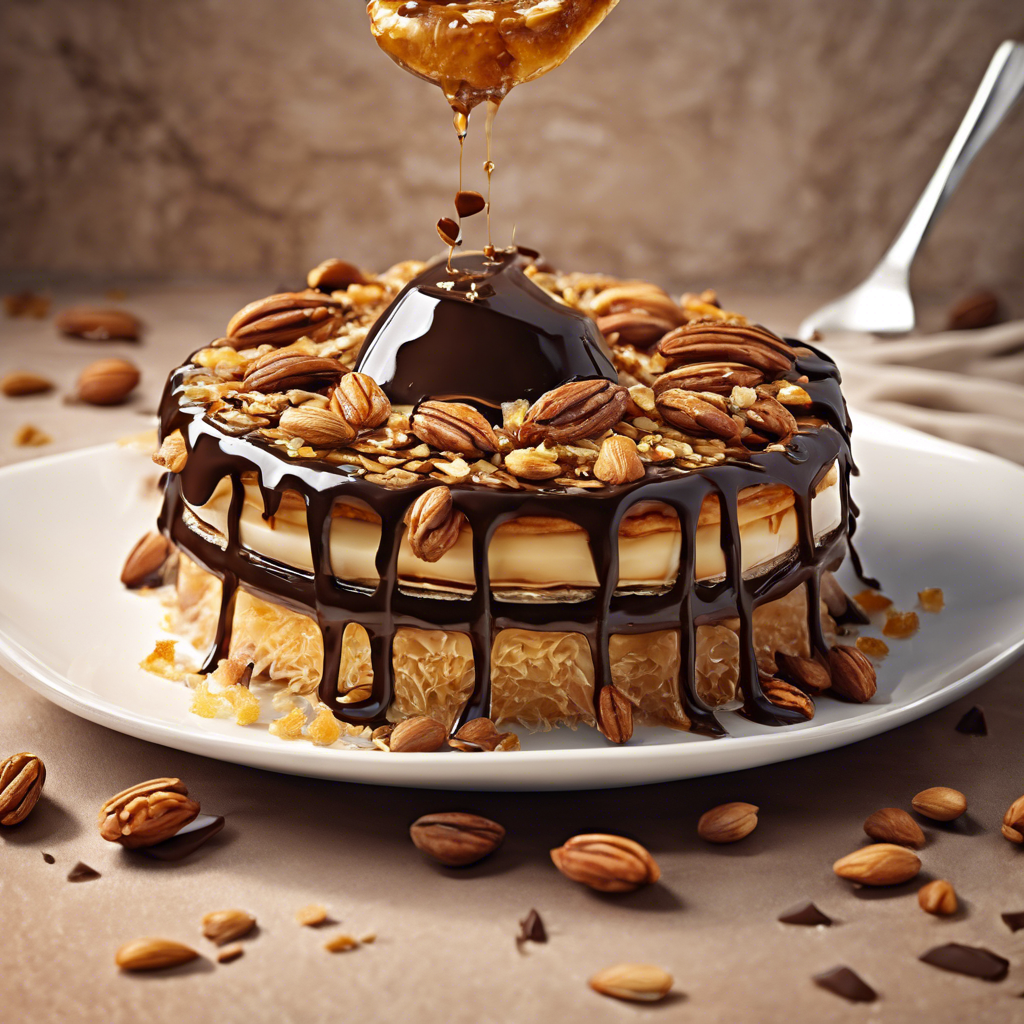The Chocolate Drizzled Kunafa with Caramelized Nuts and a sprinkle of sea salt is a modern twist on the traditional Middle Eastern dessert. Originating in the Levant region, kunafa is a pastry made with thin noodle-like pastry soaked in sweet, sugar-based syrup. The addition of chocolate drizzle and caramelized nuts adds a decadent touch to this beloved dessert, while the sprinkle of sea salt provides a perfect balance of flavors. This delectable creation has gained popularity in recent years, with chefs and restaurants around the world putting their own unique spin on the classic kunafa. The rich history of kunafa dates back centuries, with each region adding its own flair to the dish. Today, the best versions of this dessert can be found in specialty bakeries and Middle Eastern restaurants known for their authentic and innovative approach to traditional recipes. To make the perfect Chocolate Drizzled Kunafa with Caramelized Nuts, it's essential to get the balance of sweetness and saltiness just right. The kunafa pastry should be crispy and golden, while the caramelized nuts add a delightful crunch and nutty flavor. The chocolate drizzle should be smooth and decadent, and the sprinkle of sea salt should enhance the overall taste without overpowering the dessert. For those looking to try a different approach, some chefs have experimented with alternative methods of making kunafa, such as using different types of nuts or incorporating unique flavor infusions into the chocolate drizzle. Regardless of the variation, the key to a memorable Chocolate Drizzled Kunafa with Caramelized Nuts lies in the perfect harmony of textures and flavors, making it a truly irresistible treat for any dessert lover.