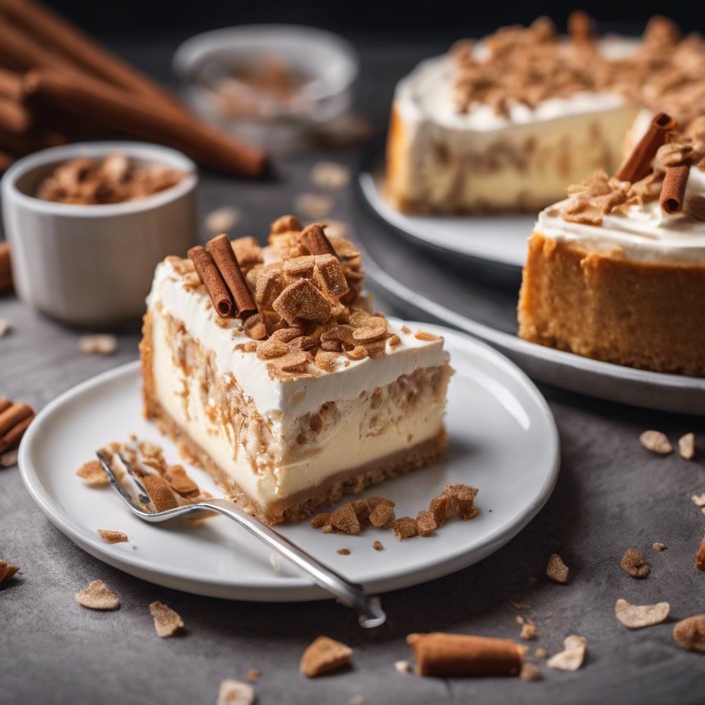 - Sprinkle additional crushed Cinnamon Toast Crunch cereal on top for garnish. Slice and serve chilled. Enjoy!