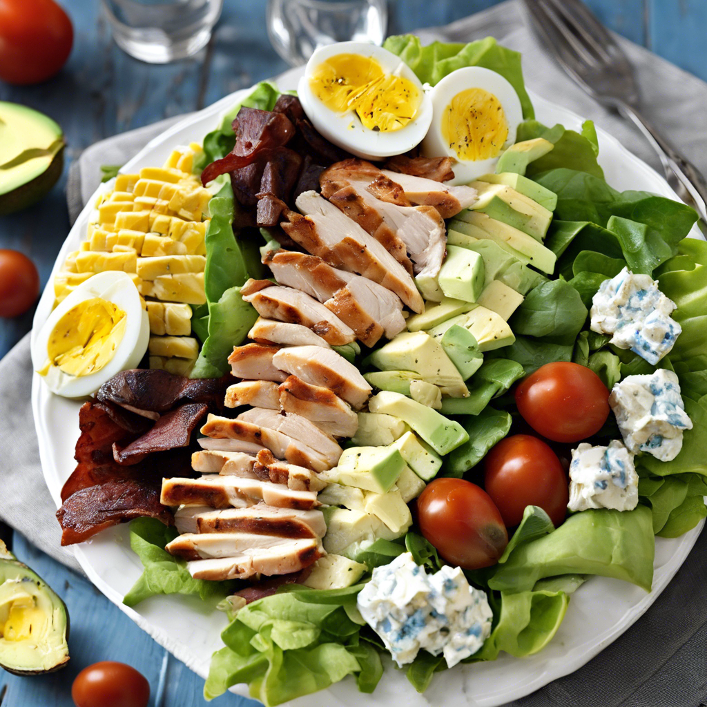 - In a large bowl, combine 6 cups of mixed salad greens, 4 chopped hard-boiled eggs, 1 cup of halved cherry tomatoes, 1 diced avocado, 1/2 cup of crumbled blue cheese, and 6 slices of crumbled cooked bacon.
