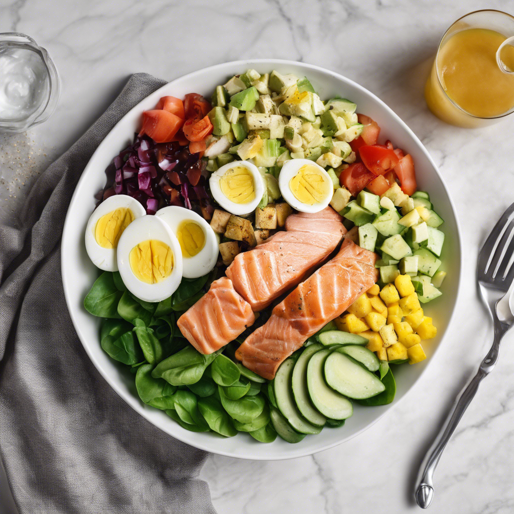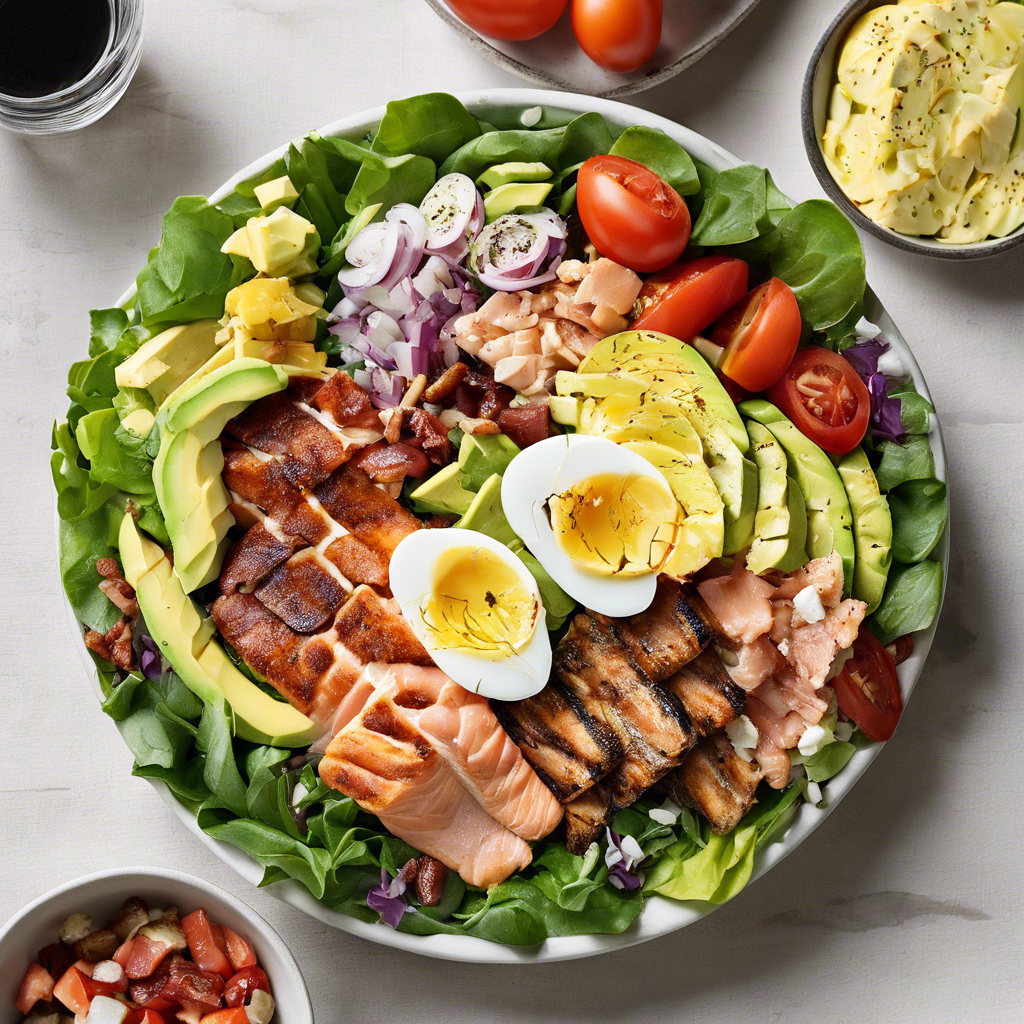 The Cobb Salad with Grilled Salmon is a classic American dish that originated in the 1930s at the Hollywood Brown Derby restaurant in California. It was created by the restaurant's owner, Robert Cobb, who tossed together leftovers from the kitchen to create this iconic salad. The salad typically includes grilled salmon, mixed greens, tomatoes, hard-boiled eggs, avocado, bacon, blue cheese, and a vinaigrette dressing. The dish gained popularity and has since become a staple in many American restaurants. Today, the best versions of this dish can be found in upscale restaurants and seafood eateries, where the freshness of the salmon and the quality of the ingredients are paramount. The key to a perfect Cobb Salad with Grilled Salmon lies in the freshness of the ingredients and the balance of flavors, making it a delightful and healthy choice for any meal.