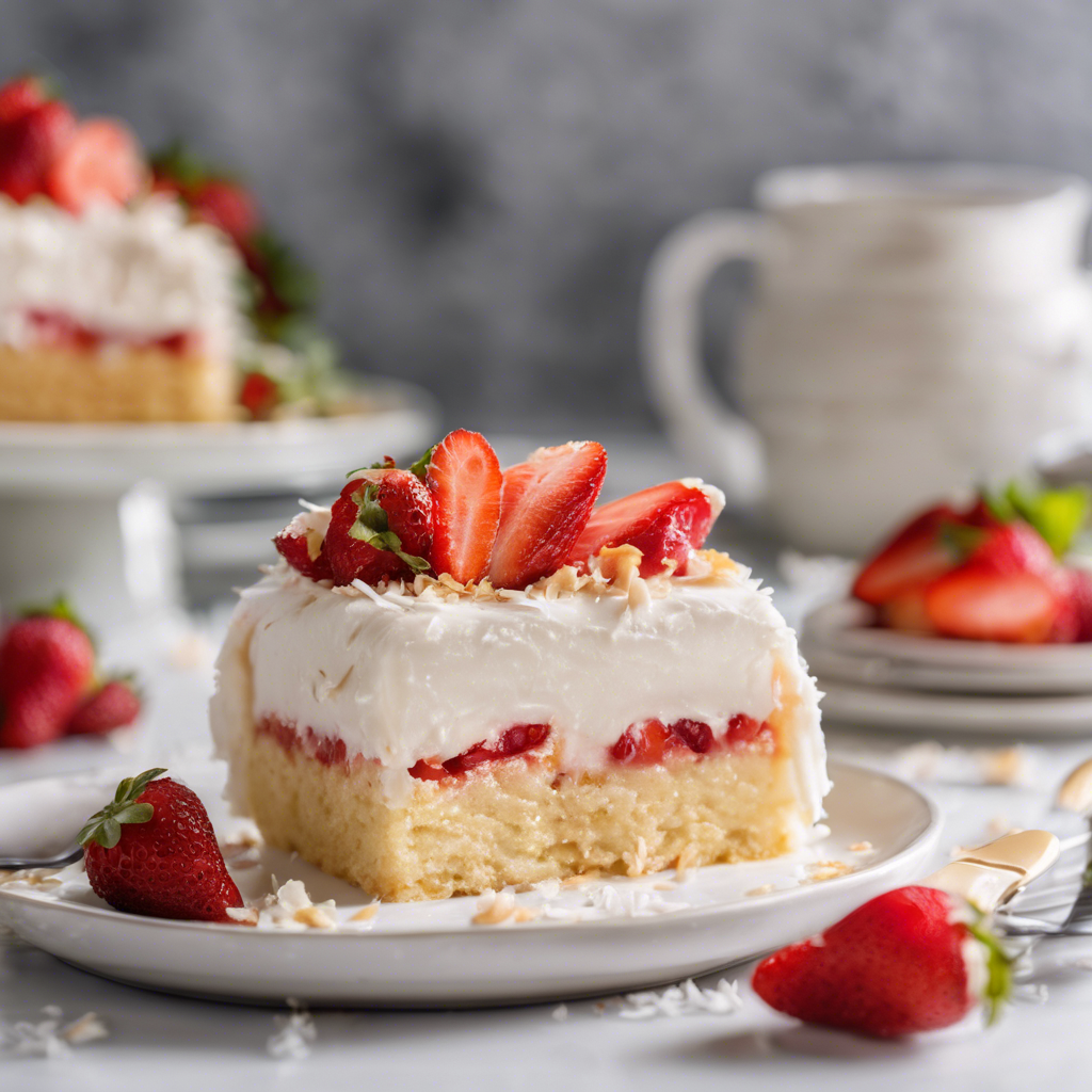 - Before serving, sprinkle the top of the cake with sweetened shredded coconut and sliced fresh strawberries. Enjoy the delicious Coconut Strawberry Tres Leches Cake!