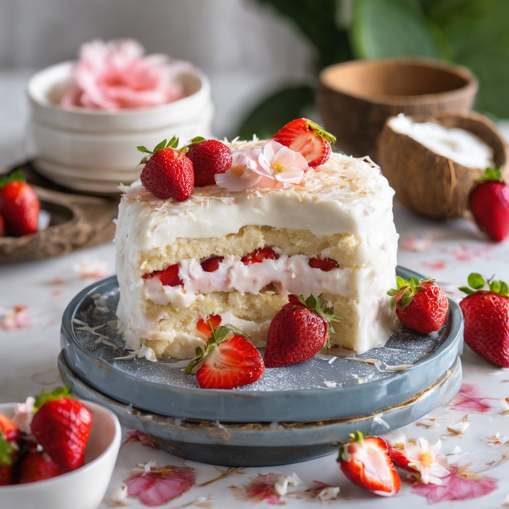 The Coconut Strawberry Tres Leches Cake with extra coconut flakes on top is a delightful twist on the classic Latin American dessert. This indulgent treat features a moist sponge cake soaked in a trio of creamy milks, topped with luscious strawberries and a generous sprinkling of coconut flakes. Renowned chefs in the Caribbean and Latin America have elevated this dessert, infusing it with tropical flavors and textures. The best version of this dish can be found in coastal regions where fresh coconuts are abundant. To make this dish shine, it's crucial to use high-quality coconut milk and fresh strawberries. For a unique twist, some chefs incorporate coconut rum into the tres leches mixture, adding a delightful depth of flavor. Whether enjoyed at a beachside cafe or homemade with love, this Coconut Strawberry Tres Leches Cake is a true celebration of tropical indulgence.