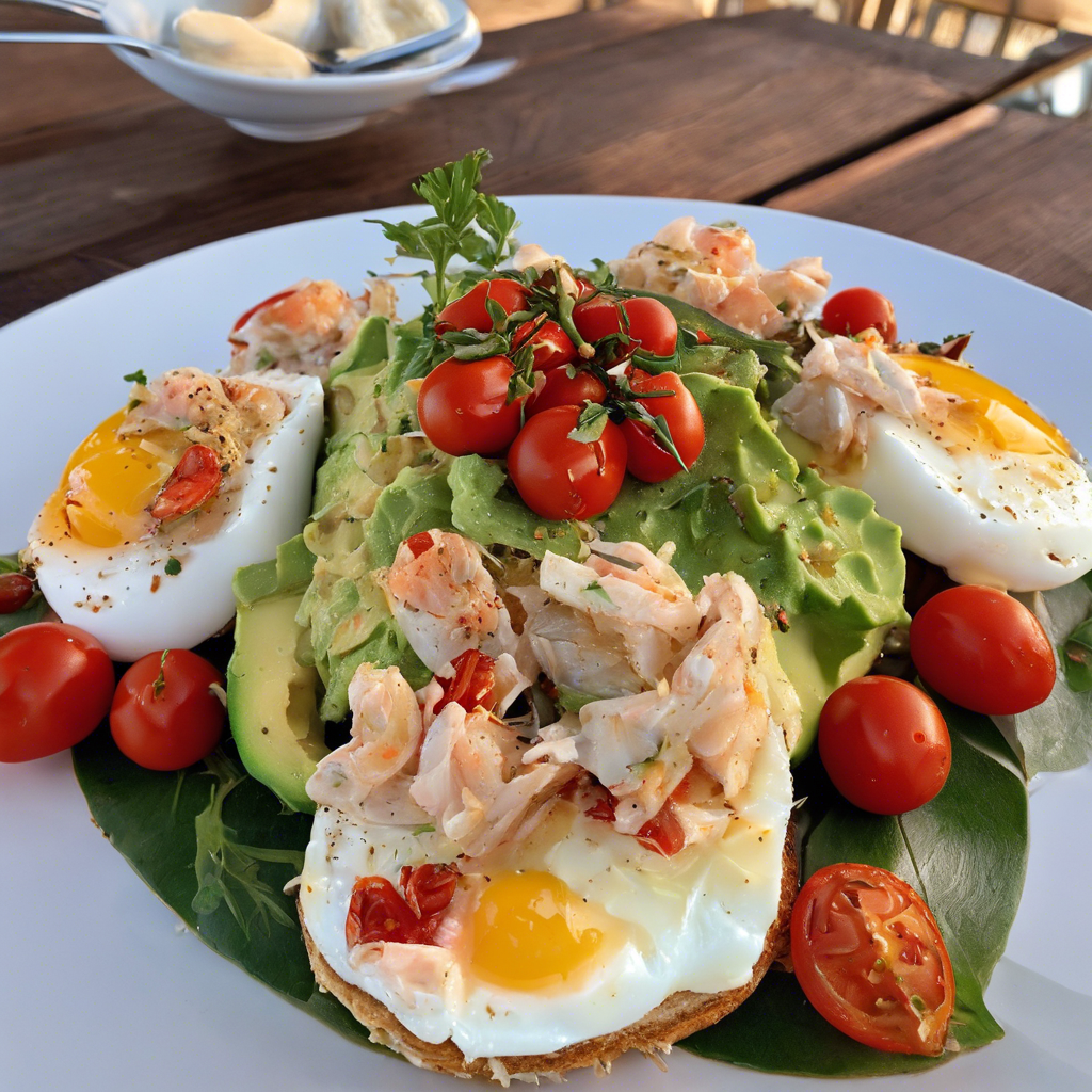Crab Eggs Chesapeake with Avocado Toast is a delectable dish that originated in the Chesapeake Bay region, known for its abundance of fresh seafood. This dish features succulent crab meat, poached eggs, and a creamy hollandaise sauce served atop a crispy slice of avocado toast. The addition of roasted cherry tomatoes on the side adds a burst of sweet and tangy flavor to complement the richness of the crab and eggs. This dish is a popular brunch option in coastal restaurants, where chefs take pride in sourcing the freshest crab and locally grown avocados. For the best version of this dish, look for restaurants with a focus on sustainable seafood and farm-to-table ingredients. The key to getting this dish right lies in the quality of the crab meat and the perfect poaching of the eggs, ensuring a runny yolk to meld with the creamy hollandaise. For a unique twist, some chefs may incorporate Old Bay seasoning or a hint of citrus to elevate the flavors of the dish. Whether enjoyed at a seaside eatery or recreated at home, Crab Eggs Chesapeake with Avocado Toast is a delightful culinary experience that celebrates the bounty of the sea.