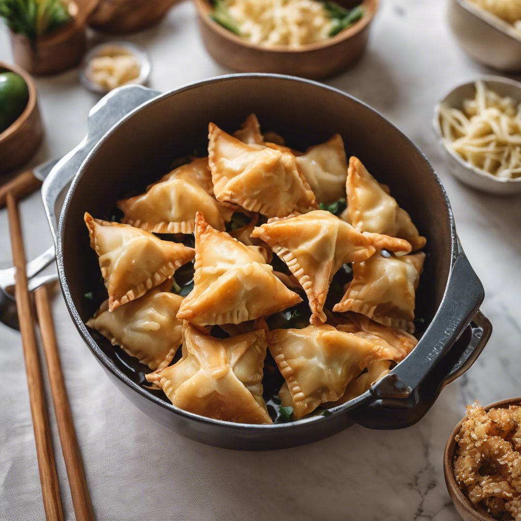 - Place about 1 tablespoon of the crab and cream cheese filling in the center of each wonton wrapper. Moisten the edges with water, then fold the wrapper in half to form a triangle, pressing to seal.