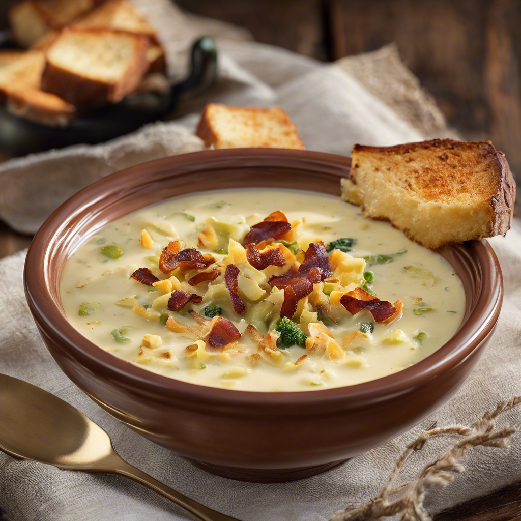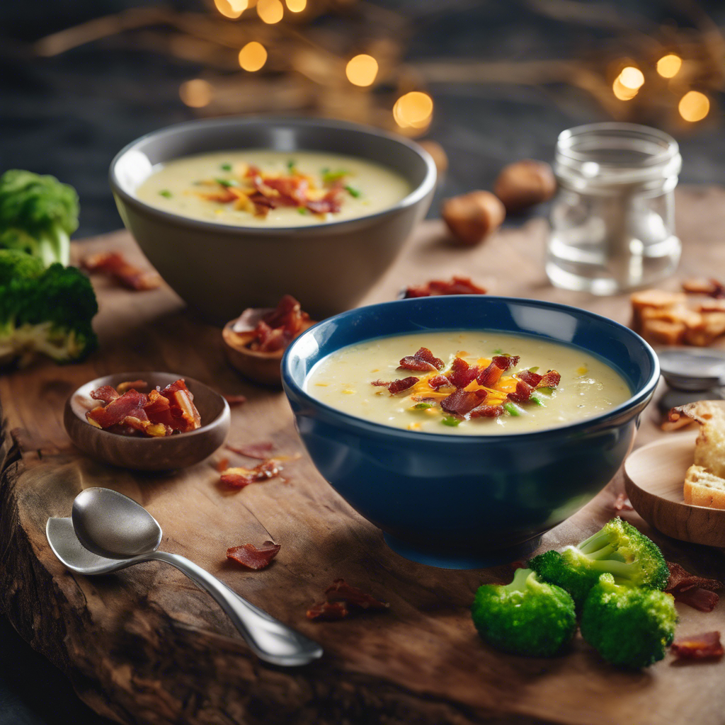 Creamy Cheddar Potato and Broccoli Soup with Crispy Bacon Bits is a comforting and hearty dish that has its roots in American cuisine. This rich and flavorful soup has been a staple in many households and restaurants across the United States for decades. The dish is believed to have originated in the Midwest, where hearty and comforting meals are a way of life. The key to a delicious Creamy Cheddar Potato and Broccoli Soup is the quality of the ingredients. Fresh broccoli, creamy cheddar cheese, and crispy bacon are essential components that give this soup its signature flavor and texture. Chefs across the country have put their own spin on this classic recipe, adding their unique touches to create a dish that is both familiar and innovative. One famous alternative method for making this dish involves using a slow cooker to simmer the ingredients for several hours, allowing the flavors to meld together and create a truly decadent soup. This method is popular among home cooks who want to enjoy a delicious and satisfying meal with minimal effort. Today, some of the best versions of Creamy Cheddar Potato and Broccoli Soup with Crispy Bacon Bits can be found in cozy diners and family-owned restaurants throughout the Midwest. These establishments take pride in using locally sourced ingredients and time-honored recipes to create a soup that is both nostalgic and irresistible. Whether enjoyed as a comforting weeknight dinner or a special treat on a chilly day, Creamy Cheddar Potato and Broccoli Soup with Crispy Bacon Bits continues to hold a special place in the hearts of food lovers across the country.