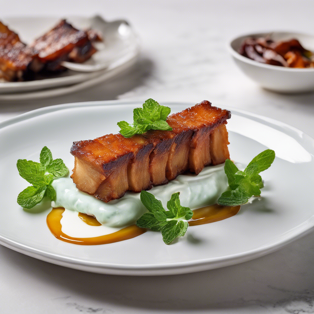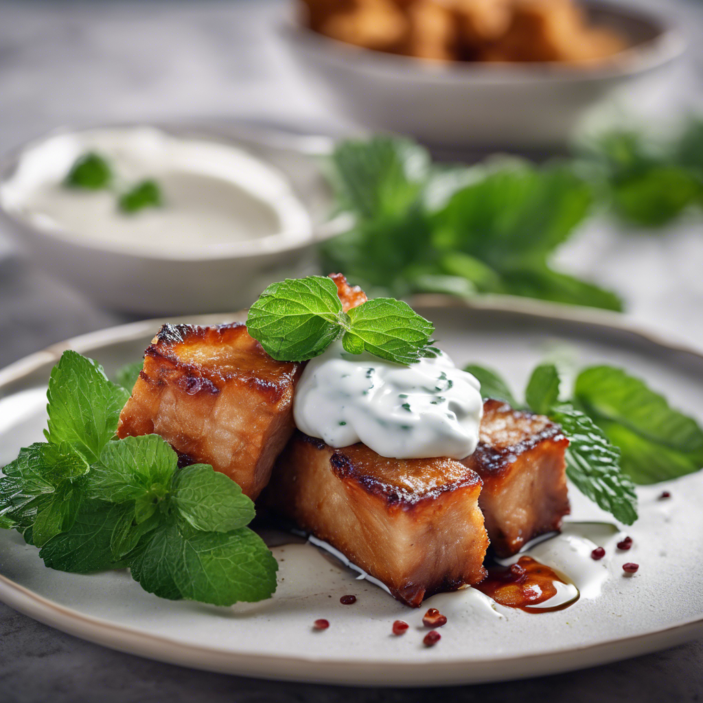 Crispy Pork Belly with Mint Yogurt Sauce is a delectable dish that has its roots in traditional Asian and Mediterranean cuisines. The succulent pork belly is slow-roasted to achieve a crispy, golden-brown exterior while maintaining its tender, juicy interior. The dish is often seasoned with a blend of aromatic spices and herbs, such as cumin, coriander, and garlic, to enhance its rich flavor profile. The mint yogurt sauce, a refreshing and tangy accompaniment, adds a delightful contrast to the savory pork belly. The creamy yogurt is infused with fresh mint, garlic, and a hint of lemon juice, creating a harmonious balance of flavors. Renowned chefs and restaurants across the globe have put their own unique spin on this classic dish. In Asia, it is often served with a side of pickled vegetables or steamed rice, while in the Mediterranean, it may be paired with a crisp salad or grilled vegetables. For those seeking the best version of this dish, look no further than the bustling street markets of Southeast Asia, where local vendors expertly prepare and serve this mouthwatering delicacy. The key to achieving the perfect Crispy Pork Belly with Mint Yogurt Sauce lies in the careful balance of textures and flavors. The pork belly must be cooked to a crisp, crackling perfection, while the mint yogurt sauce should be creamy, tangy, and infused with the vibrant essence of fresh mint. While the traditional method of slow-roasting the pork belly yields exceptional results, adventurous home cooks may also explore alternative cooking techniques, such as grilling or braising, to achieve equally tantalizing outcomes. Whether enjoyed as a main course or as a flavorful addition to a shared meal, Crispy Pork Belly with Mint Yogurt Sauce is a culinary masterpiece that continues to captivate the palates of food enthusiasts worldwide.