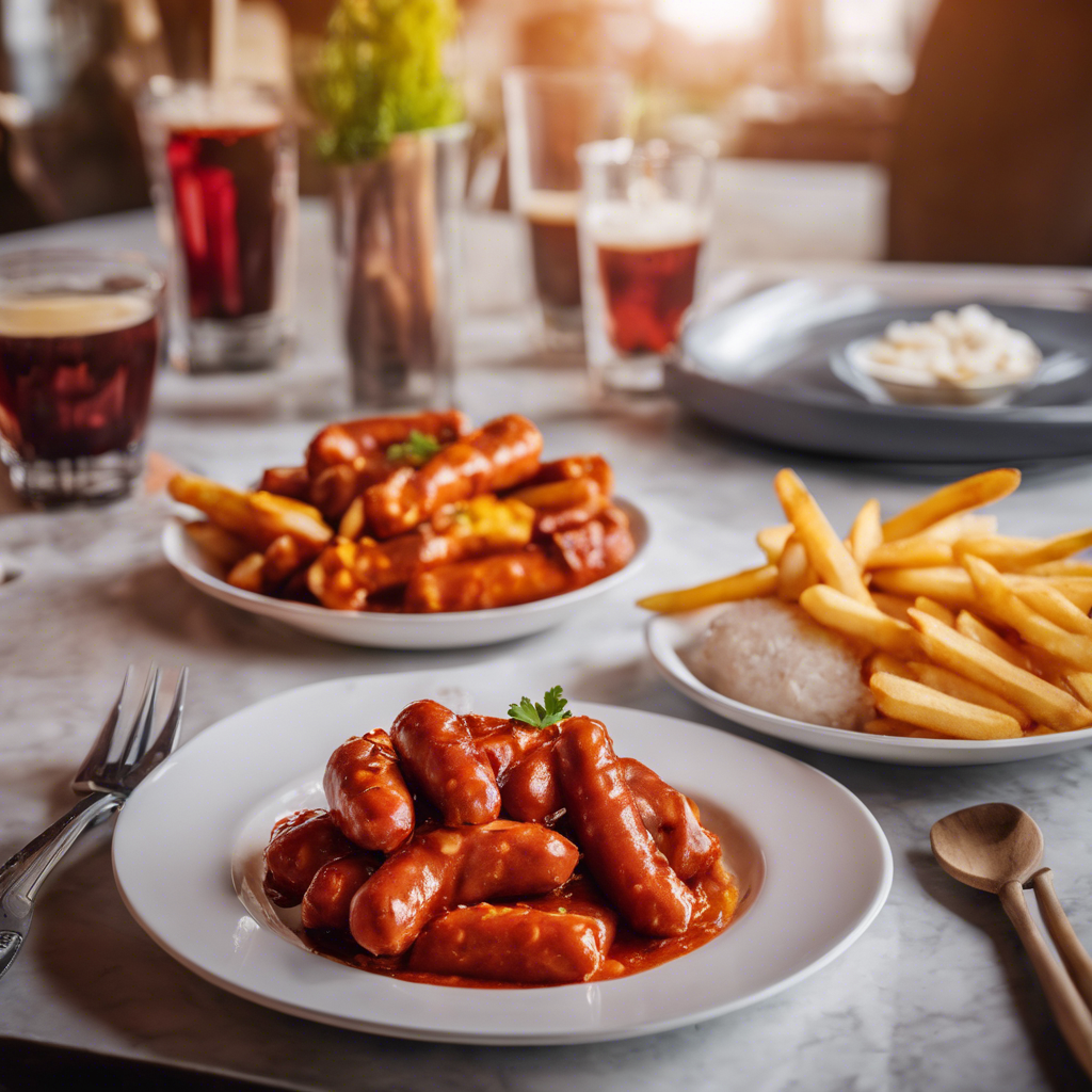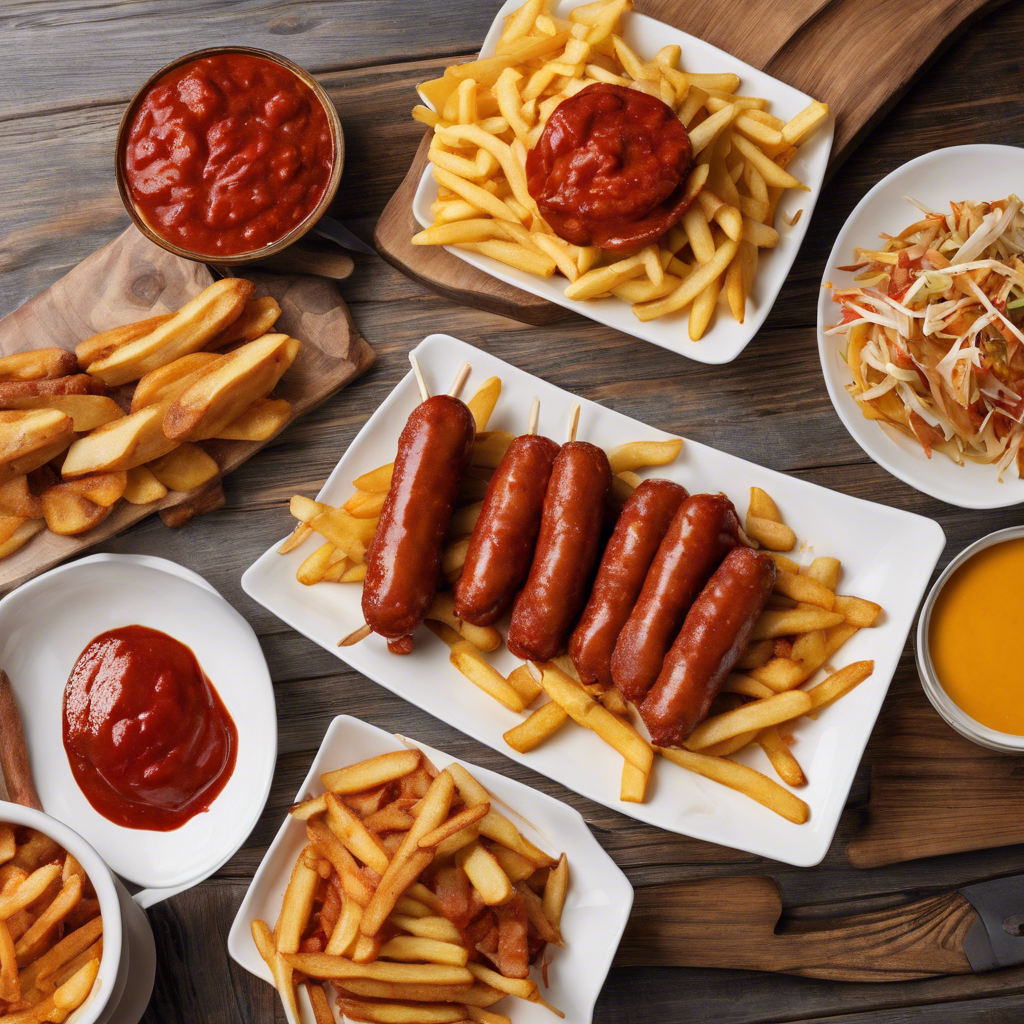 - To serve, place a cooked bratwurst on a plate, smother it with the curry ketchup sauce, and serve with a generous portion of crispy fries.