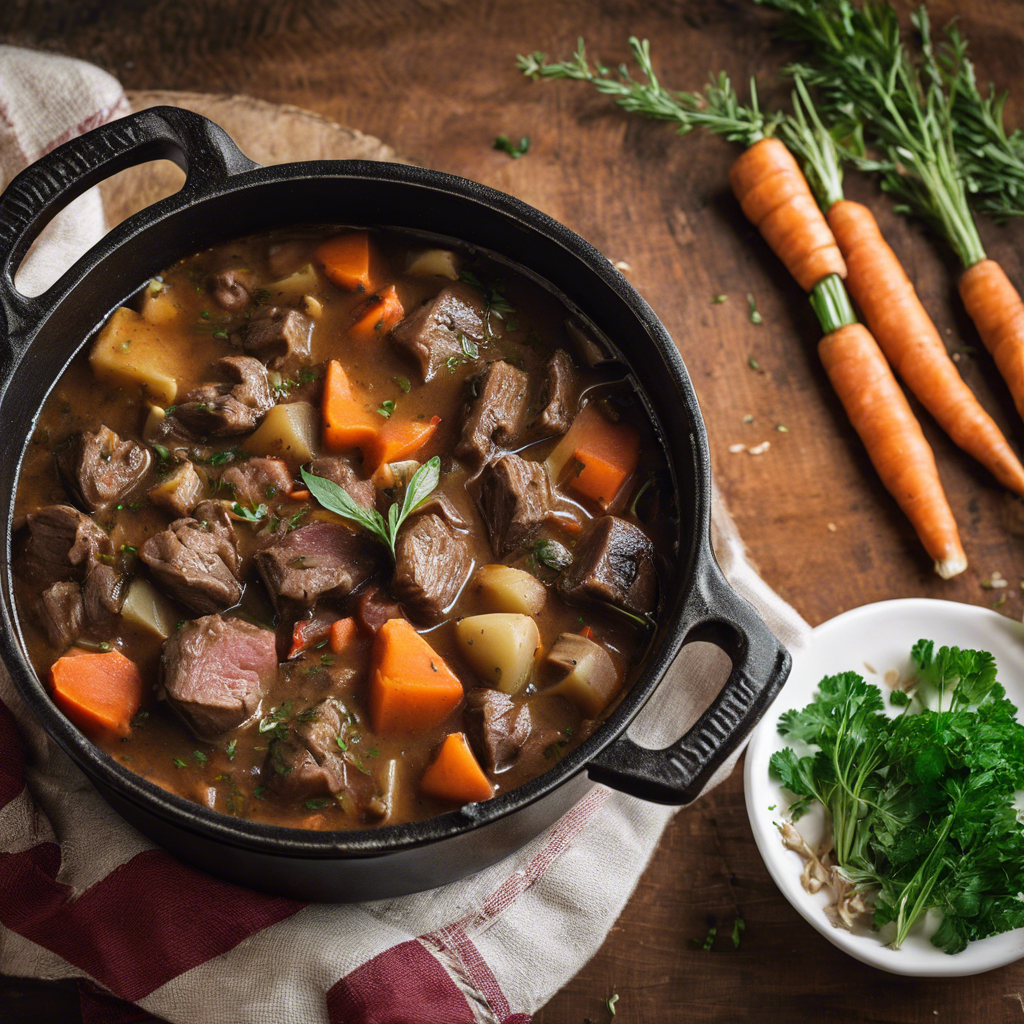 - Add the carrots and potatoes to the Dutch oven, cover, and continue to simmer for an additional 1 hour, or until the meat and vegetables are tender.