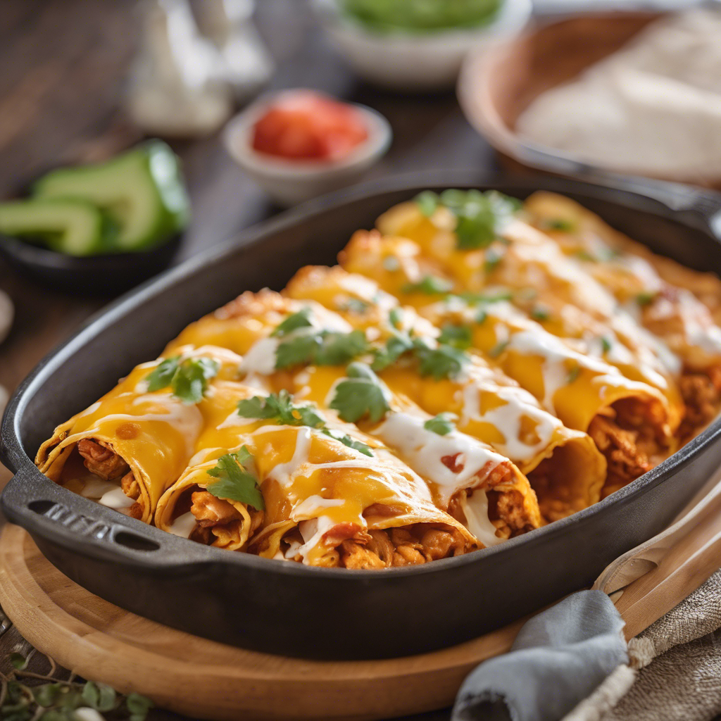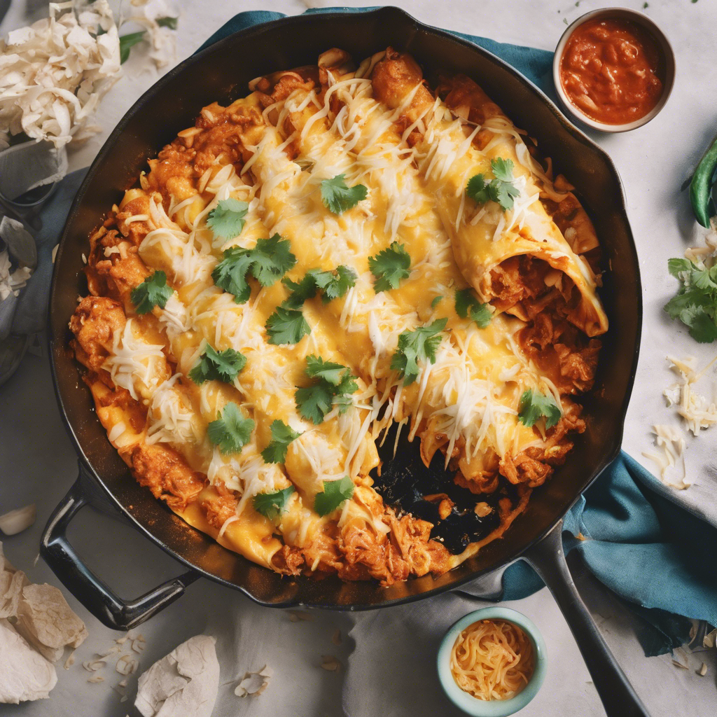 - Allow to cool for 5 minutes before serving. Enjoy your cheesy chicken enchiladas!