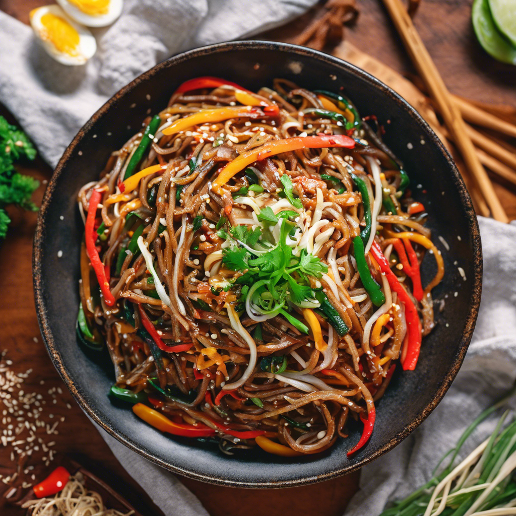 Extra Vegetable Japchae with a spicy gochujang sauce is a modern twist on the traditional Korean dish. Originating from the royal court cuisine of the Joseon dynasty, Japchae is a stir-fried noodle dish made with sweet potato starch noodles, vegetables, and sometimes meat. The addition of extra vegetables and a spicy gochujang sauce gives this dish a flavorful kick. Renowned chefs in Seoul have popularized this variation, infusing it with their own creative flair. The best version of this dish can be found in bustling street food markets and trendy restaurants in South Korea. The key to perfecting this dish lies in achieving the right balance of textures and flavors, with the gochujang sauce providing a fiery punch. For a unique twist, some chefs also incorporate seafood or tofu to cater to different dietary preferences. Whether enjoyed in a traditional setting or with a modern twist, Extra Vegetable Japchae with a spicy gochujang sauce is a delightful culinary experience that showcases the rich flavors of Korean cuisine.