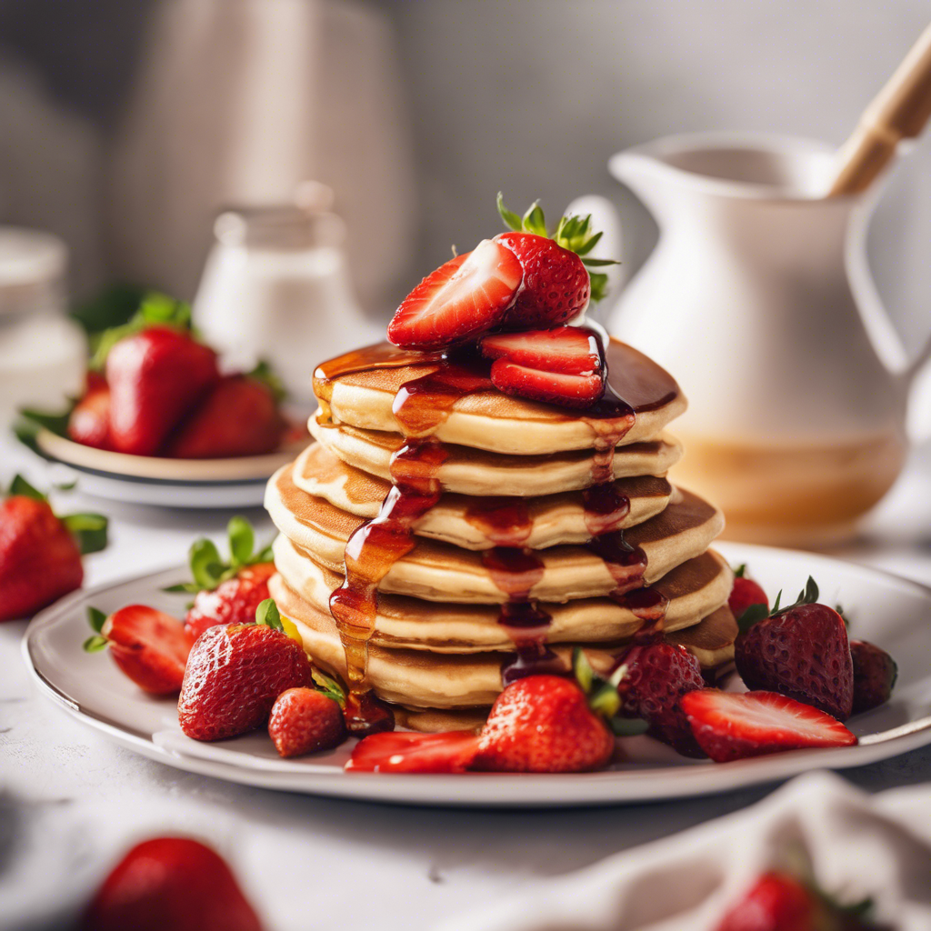 - Serve the pancakes hot, topped with maple syrup and fresh strawberries.
