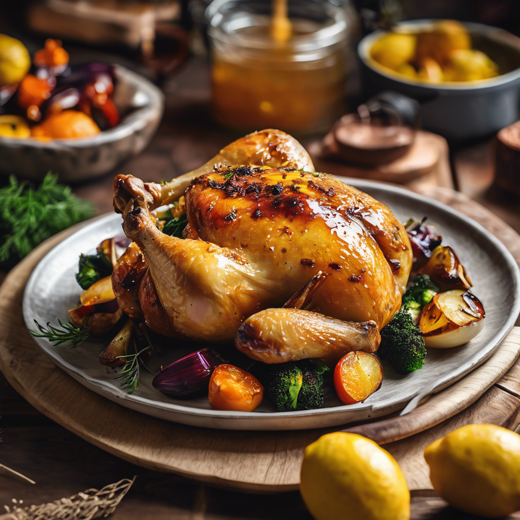A delicious and flavorful roasted chicken with a sweet and tangy honey glaze, infused with lemon and garlic, served with a side of perfectly roasted vegetables.