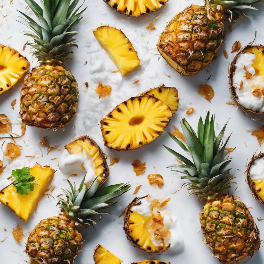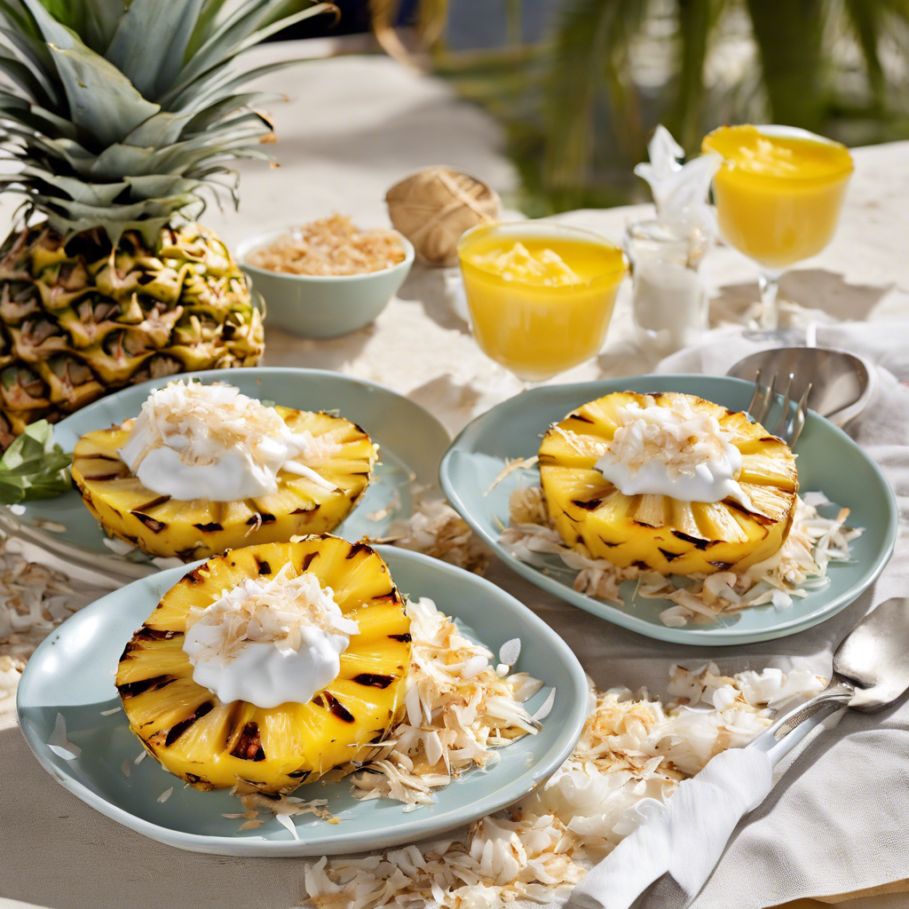 Grilled Pineapple with Coconut Cream is a tropical delight that has its roots in the vibrant flavors of Southeast Asia and the Pacific Islands. This dish combines the sweetness of ripe pineapple with the rich, creamy texture of coconut cream, and the nutty crunch of toasted coconut flakes. The dish has gained popularity in recent years, thanks to its refreshing and indulgent taste. The history of this dish can be traced back to the traditional cuisine of countries like Thailand, Indonesia, and the Philippines, where pineapple and coconut are abundant. Chefs in these regions have long been using these ingredients to create a harmonious blend of sweet and savory flavors. In recent years, this dish has made its way onto the menus of trendy restaurants and beachside eateries around the world. Chefs have put their own spin on the classic recipe, experimenting with different grilling techniques for the pineapple and infusing the coconut cream with aromatic spices like vanilla or lemongrass. Today, the best versions of this dish can be found in upscale tropical resorts, where chefs source the freshest pineapples and coconuts to create a truly indulgent experience. The key to getting this dish right lies in the quality of the ingredients - ripe, juicy pineapple, creamy coconut cream, and perfectly toasted coconut flakes. For those looking to recreate this dish at home, a popular alternative method involves skewering pineapple chunks and grilling them over an open flame to caramelize the natural sugars and enhance the fruit's sweetness. The coconut cream can be made by simmering coconut milk with a touch of sugar and a pinch of salt, then chilled to achieve a luscious, velvety texture. Whether enjoyed at a tropical resort or whipped up in your own kitchen, Grilled Pineapple with Coconut Cream and toasted coconut flakes is a delightful treat that captures the essence of a sun-soaked paradise.