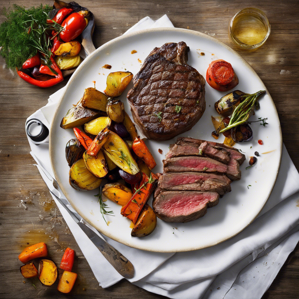 The history of Grilled Ribeye Steak served with roasted vegetables dates back to the tradition of open-fire cooking in the American West. This classic dish has evolved over time, with chefs and home cooks adding their own unique twists and flavors to the recipe. The succulent marbling of the ribeye steak, when grilled to perfection, pairs beautifully with the caramelized sweetness of roasted vegetables. This dish has become a staple in steakhouses and fine dining restaurants across the United States, with renowned chefs in regions like Texas and the Midwest putting their own spin on the dish. For the best version of this dish, sourcing high-quality ribeye steak and fresh, seasonal vegetables is essential. The key to achieving the perfect flavor lies in the seasoning and grilling technique, ensuring a juicy, tender steak and perfectly roasted vegetables.