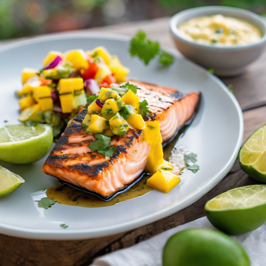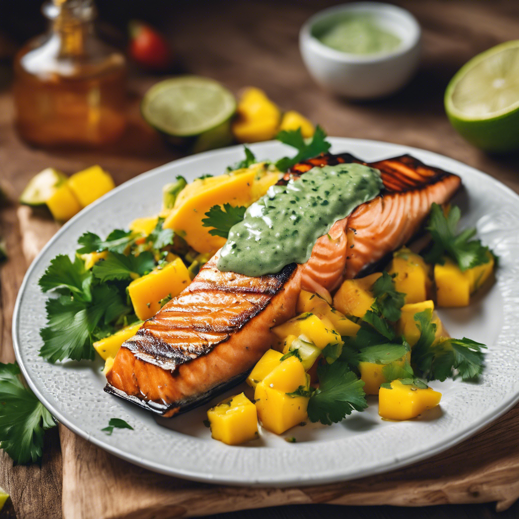 Grilled Salmon with Cilantro Lime Sauce topped with a zesty mango salsa is a fusion of flavors that has become a favorite in modern seafood cuisine. This dish has its roots in the coastal regions of Latin America, where the abundance of fresh seafood and tropical fruits inspired chefs to create vibrant and flavorful dishes. The succulent salmon is marinated in a tangy cilantro lime sauce, then grilled to perfection, creating a smoky char that complements the fish's natural richness. The mango salsa, with its sweet and spicy notes, adds a refreshing contrast, elevating the dish to a new level of culinary delight. Today, this dish can be savored in renowned seafood restaurants along the coast, where chefs expertly balance the flavors to create a harmonious dining experience. To achieve the best results, sourcing high-quality salmon and ripe, juicy mangoes is crucial, as they are the stars of this delectable creation. Whether enjoyed at a seaside eatery or prepared at home, this dish is a celebration of fresh, vibrant ingredients and expert culinary craftsmanship.