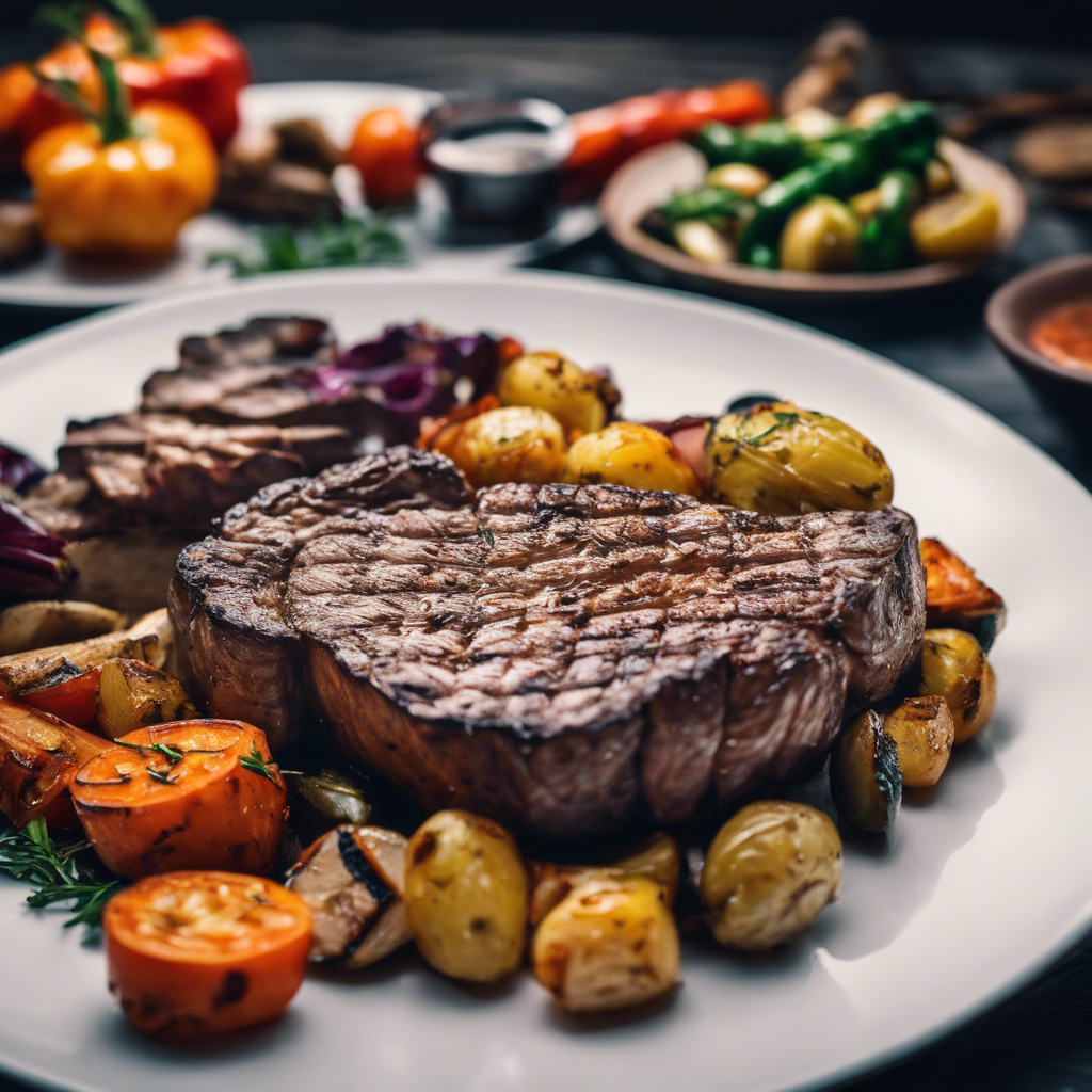 Grilled steak with a side of roasted vegetables has a rich history dating back to the early days of open-fire cooking. This classic dish has been perfected by chefs around the world, from the sizzling steakhouses of Argentina to the bustling grills of Texas. The succulent, charred flavors of the steak complement the caramelized sweetness of the roasted vegetables, creating a harmonious and satisfying meal. Today, this dish can be found in top restaurants and backyard barbecues alike, with variations that include different cuts of steak and a wide array of seasonal vegetables. The key to a perfect grilled steak and roasted vegetables lies in high-quality ingredients and precise cooking techniques. Whether it's a juicy ribeye or a tender filet mignon, the steak should be seasoned and grilled to perfection, while the vegetables should be roasted until they are tender and slightly charred. This dish is a celebration of simplicity and bold flavors, making it a timeless favorite for meat and veggie lovers alike.